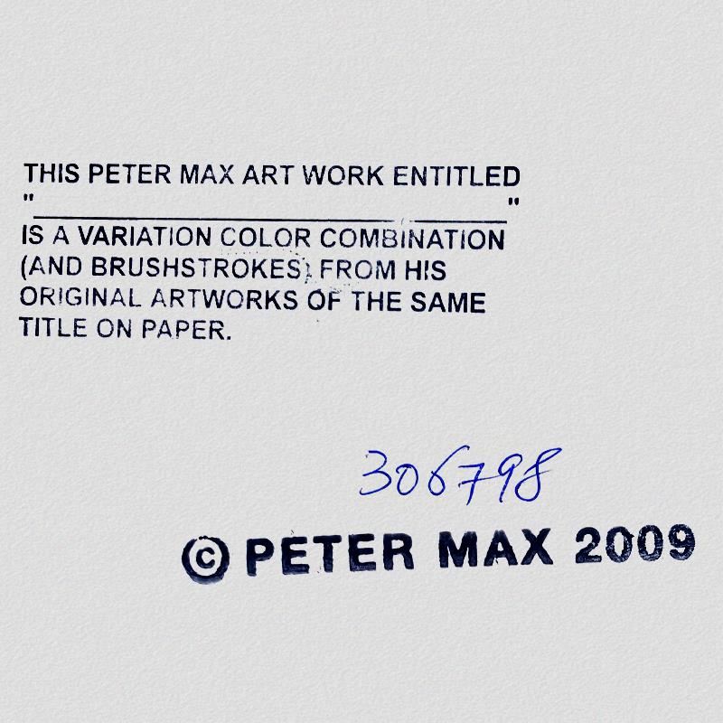 "Superbowl XXX" is a one-of-a-kind mixed media on paper, hand signed by Peter Max. The piece comes custom framed with a backside cutout to display Peter Max Studio registration number 306798 certifying authenticity. Measures approximately 48" x 36" (frame), 36" x 24" (image). This item requires special handling and may have a longer than usual turnaround.