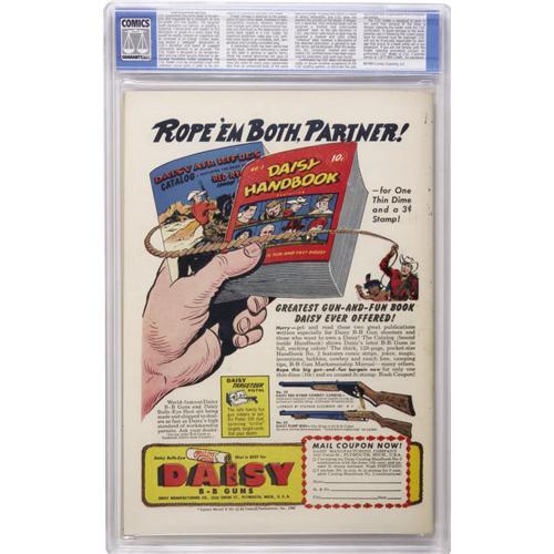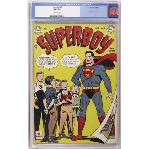 <B>Superboy #1 (DC, 1949) CGC NM- 9.2 Off-white pages.</B></I> A thirty-year run began here for this enduring series which remained in publication even through those difficult pre-Silver Age days when superheroes were largely out of fashion. Maybe DC's formula for the book had something to do with it -- in the early days of this title, there were no super-powered villains (young Lex Luthor, etc.) and Superboy wasn't whisked off to the future to join the Legion of Super-Heroes every three hours. Instead, less flashy (but well-written) tales were the order of the day, usually with a subtle moral for young readers. The Boy of Steel's debut issue features a Wayne Boring cover and John Sikela art. This is a nice, bright copy, with a vivid yellow background that really pops the red and blue of Superman's costume right off the cover! This tight copy with square corners will be all but impossible to improve upon. Overstreet 2006 NM- 9.2 value = $12,800. CGC census 10/06: 1 in 9.2, none higher.<BR><BR><b>Shipping:</b> Slabbed Comic (<a target="_blank" href="http://www.heritageauctions.com/common/shipping.php">view shipping information</a>)