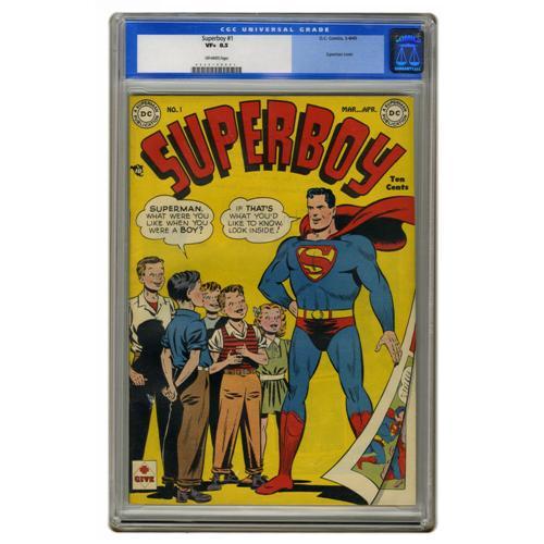 <B>Superboy #1 (DC, 1949) CGC VF+ 8.5 Off-white pages.</B></I> This key debut issue doesn't even feature the title character on the cover -- instead, it's the grown-up Superman who is seen enticing kids to turn the pages. The adventures of Superman as a boy was a natural idea. Joe Shuster and Jerry Siegel, fresh from a stint in the military, created the first Superboy stories, which originally saw print in <B>More Fun Comics</B></I> before this spinoff title was released in 1949. A thirty year run was the result. This sharp copy is sure to please, with no major problems or defects to report. Overstreet 2006 VF 8.0 value = $5,432; VF/NM 9.0 value = $9,116. CGC census 3/06: 3 in 8.5, 2 higher.