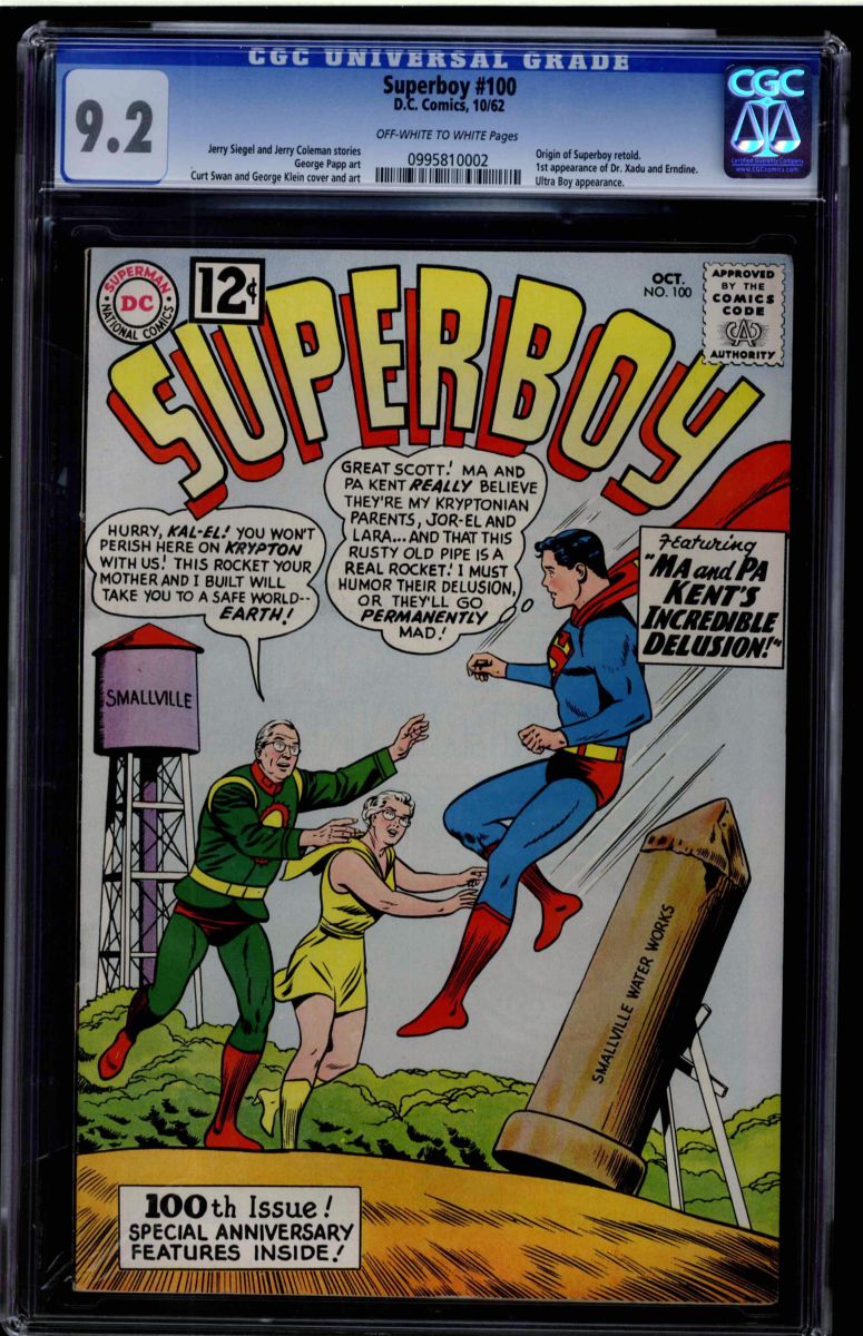 Superboy #100 CGC 9.2 off-white to white pages. erry Siegel and Jerry Coleman stories. George Papp art, Curt Swan and George Klein cover and art. 1st appearance of Dr. Xadu and Erndine. Ultra Boy appearance. Origin of Superboy retold. Overstreet 2009 NM 9.2 value = $360. CGC census: 4 at 9.2, 1 higher.