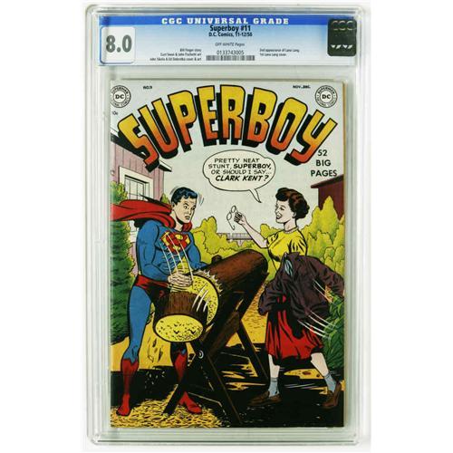 <B>Superboy #11 (DC, 1950) CGC VF 8.0 Off-white pages.</B></I> It's the first-ever cover appearance of DC's most famous redhead, Lana Lang -- except that here, she's a brunette! It's Lana's second story appearance overall. The issue has a John Sikela cover, with interior art by Sikela and Curt Swan. Overstreet 2005 VF 8.0 value = $456. CGC census 12/05: 1 in 8.0, higher.