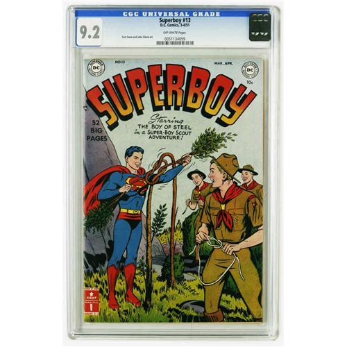 <B>Superboy #13 (DC, 1951) CGC NM- 9.2 Off-white pages.</B></I> Superboy gives a few Boy Scouts a rather unorthodox lesson in knot tying on this colorful cover illustration. Artists include Curt Swan and John Sikela. This issue also introduces a now-forgotten member of the extended Superboy family -- Lana Lang's brother, Larry! This copy, one of only four listed, is currently the highest CGC-graded example of issue #13. Overstreet 2005 NM- 9.2 value = $950. CGC census 11/05: 1 in 9.2, none higher.