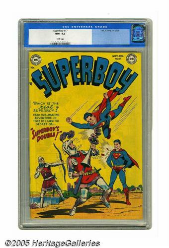 <B>Superboy #17 (DC, 1951) CGC NM- 9.2 White pages.</B></I> Outside of locating Professor Peabody's "Wabac" machine and dropping in on 1951, you might have a tough time finding a really choice copy of this issue of <B>Superboy</B></I>. Check with CGC -- they currently list a total of only three graded copies of this issue, in 4.0, 5.0, and... this colorful white-paged beauty. Better get that bid in, you condition connoisseurs! Overstreet 2005 NM- 9.2 value = $625. CGC census 6/05: 1 in 9.2, none higher.