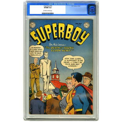 <B>Superboy #19 (DC, 1952) CGC VF/NM 9.0 Off-white to white pages.</B></I> The Boy of Steel finds himself in a sticky wicket in this issue's cover story, entitled "The Death of Young Clark Kent." There's nothing sticky about this superb copy, though; it's rock-solid. And if you're thinking of waiting for a higher-graded copy to come along, be advised the wait may be long; to date, this is the only copy of issue #19 certified by CGC. Overstreet 2006 VF/NM 9.0 value = $478; NM- 9.2 value = $650. CGC census 3/06: 1 in 9.0, none higher.