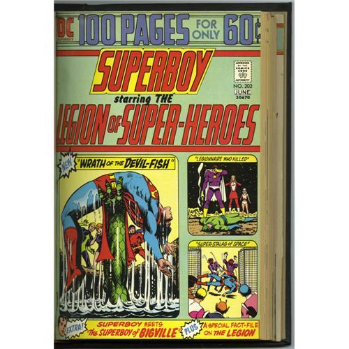 <B>Superboy #193-208 Bound Volume (DC, 1973-75).</B></I> The Legion of Super-Heroes appears in every issue collected here! Among the highlights are the first appearance of one of the coolest-looking heroes of all time, Erg-1 (aka Wildfire), in #195, as well as the first comic book work by Legion artist extraordinaire Mike Grell (#202). These copies have been trimmed and bound into a black hardcover volume. The cover gloss of the comics is superb. A very slight water stain at the top of the volume affects all issues. Overstreet 2006 VG 4.0 value for group = $81. <BR><BR><B>Important notice:</B> Heritage usually auctions material at the rate of 200-250 lots per hour. On some occasions eBay Live bid software or the Internet may not be able to keep up with the pace of the auction. We recommend placing a realistic absentee bid now as insurance to avoid disappointment. Occasionally the auctioneer may eliminate or reject an eBay Live bid, and the auctioneer may also reopen a lot after the close of the eBay live bidding (usually because we missed an audience bid), and may reject your bid even if it shows you as the winning bidder. By bidding via eBay Live, you agree that Heritage may award the lot to another bidder at its sole discretion under the circumstances described above or any other reasonable circumstances. Since eBay bids are not shown to us until we open the lot on the floor, we treat those bids just like floor bids. In most cases the floor responds before the eBay bid is presented to us, due to Internet lag time, so for consistency we have made it a policy that floor bids are always considered first over tie eBay live bids. Also please note that all Heritage lots purchased through eBay Live carry a 22.5% Buyer's Premium. Please make sure you read the Terms and Conditions before you bid. This lot is being auctioned in conjunction with a live floor auction by Heritage Auction Galleries. All final auction and invoice information will be supplied by Heritage Auction Galleries, and all other information should be considered preliminary. Lot:41001 <BR><BR><B>Winning Notification and Billing:</B> After the FINAL session in this auction is complete, Heritage will send e-mail and snail mail invoices. This process normally takes several days. All final auction and invoice information will be supplied by Heritage Auction Galleries, and all other information should be considered preliminary. <BR><BR>This auction will be conducted on a live auction floor and over the Internet through eBay Live. If you choose to place an absentee bid, please take a moment to <font color='#0000ff'><u><a href='http://pages.ebay.com/liveauctions/help/before/laabsentee.html'>learn how eBay Live absentee bidding works</a></u></font><font color='#000000'>