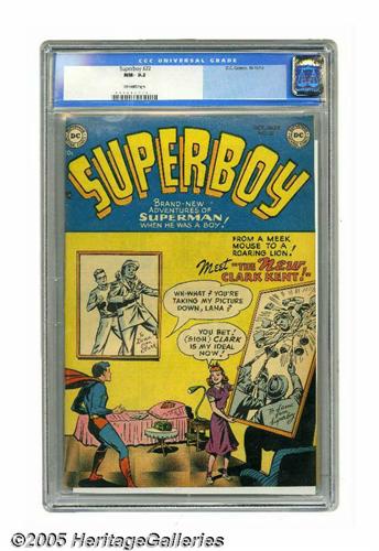 <B>Superboy #22 (DC, 1952) CGC NM- 9.2 Off-white pages.</B></I> There's nothing quite like a near-mint copy when it comes to collecting comic books. Here's just such a book, yet at first glance, the logo's subtle color scheme of yellow and light orange may appear faded. Trust us, there is no fading; check out the vivid red in Superboy's cape, shorts, and boots. This is a very sharp copy. And to top it off, there's an early Lana Lang cover appearance, too. Overstreet 2005 NM- 9.2 value = $475. CGC census 6/05: 1 in 9.2, none higher.