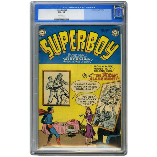 <B>Superboy #22 (DC, 1952) CGC NM- 9.2 Off-white pages.</B></I> There's nothing quite like a near-mint copy when it comes to collecting comic books. Here's just such a book, yet at first glance, the logo's subtle color scheme of yellow and light orange may appear faded. Trust us, there is no fading; check out the vivid red in Superboy's cape, shorts, and boots. This is a very sharp copy. And to top it off, there's an early Lana Lang cover appearance, too. Overstreet 2006 NM- 9.2 value = $500. CGC census 3/06: 1 in 9.2, none higher.