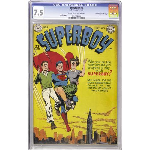<B>Superboy #4 Davis Crippen ("D" Copy) pedigree (DC, 1949) CGC VF- 7.5 Cream to off-white pages.</B></I> A Wayne Boring cover, which announces a "super" contest, wraps this early issue, while John Sikela and Henry Boltinoff provide the interior art. The next highest CGC-graded copy on the current census sits at a mere 5.5. Overstreet 2006 VF 8.0 value = $681. CGC census 12/06: 1 in 7.5, none higher. <I>From the Crippen Collection</B></I>.<BR><BR><b>Shipping:</b> Slabbed Comic (<a target="_blank" href="http://www.heritageauctions.com/common/shipping.php">view shipping information</a>)