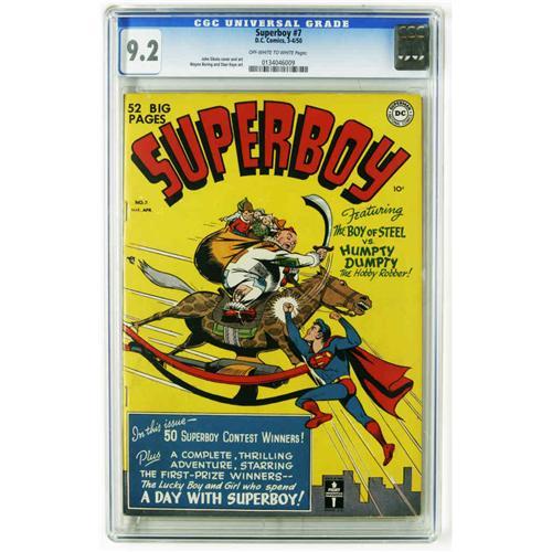 <B>Superboy #7 (DC, 1950) CGC NM- 9.2 Off-white to white pages.</B></I> As of this writing, this copy tops CGC's census by a healthy margin as the only copy certified with a grade above 9.2. The book has a John Sikela cover, with interior art by Sikela, Stan Kaye, and Wayne Boring. Overstreet 2005 NM- 9.2 value = $1,225. CGC census 12/05: 1 in 9.2, none higher.