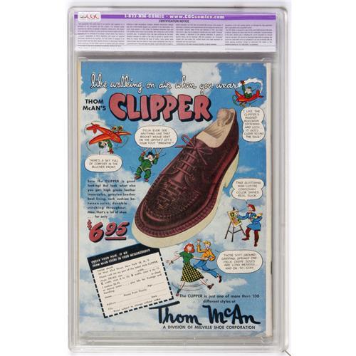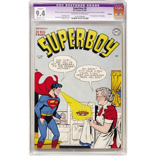 <B>Superboy #8 (DC, 1950) CGC Apparent NM 9.4 Moderate (P) Off-white to white pages.</B></I> Superboy spies...with his x-ray eyes...a blueberry pie. Hey, we feel a groove comin' on! Al Plastino donates the cover art while Curt Swan and John Sikela offer the interior art. This ish has the first appearance of Superbaby. CGC notes, "Restoration includes: color touch, pieces added, spine splits sealed, cover cleaned, reinforced. (2 edges trimmed)." Overstreet 2006 GD 2.0 value = $95; VG 4.0 value = $190; FN 6.0 value = $285; VF 8.0 value = $594; VF/NM 9.0 value = $940; NM- 9.2 value = $1,285.<BR><BR><b>Shipping:</b> Comics - Slabbed (certified) (<a target="_blank" href="http://www.heritageauctions.com/common/shipping.php">view shipping information</a>)