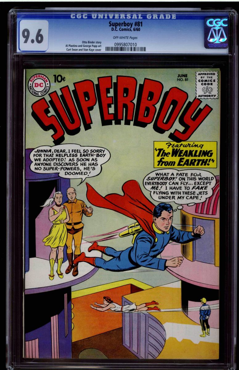 Superboy #81 CGC 9.6 off-white pages. Otto Binder story, Al Plastino and George Papp art, Curt Swan and Stan Kaye cover. Overstreet 2009 NM 9.2 value = $200. CGC census: 1 at 9.6, none higher!