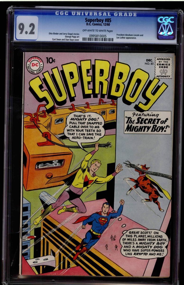 Superboy #85 CGC 9.2 off-white to white pages. Otto Binder and Jerry Siegel stories. George Papp art, Curt Swan and Stan Kaye cover. President Abraham Lincoln and Lex Luthor appearance. Overstreet 2009 NM 9.2 value = $200. CGC census: 3 at 9.2, none higher.