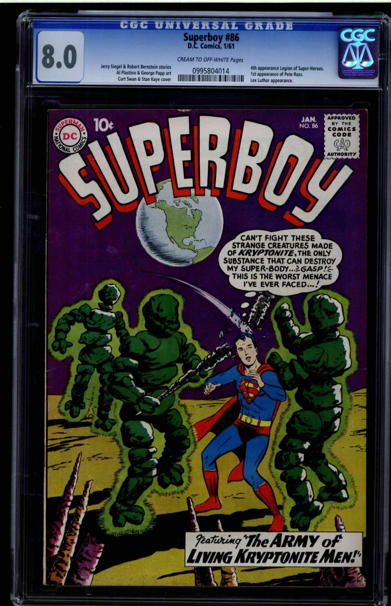 Superboy #86 CGC 8.0 cream to off-white pages. Jerry Siegel & Robert Bernstein stories. Al Plastino & George Papp art, Curt Swan & Stan Kaye cover. 4th appearance Legion of Super-Heroes. 1st appearance of Pete Ross. Lex Luthor appearance. Overstreet 2009 VF 8.0 value = $133. CGC census: 6 at 8.0, 2 higher.