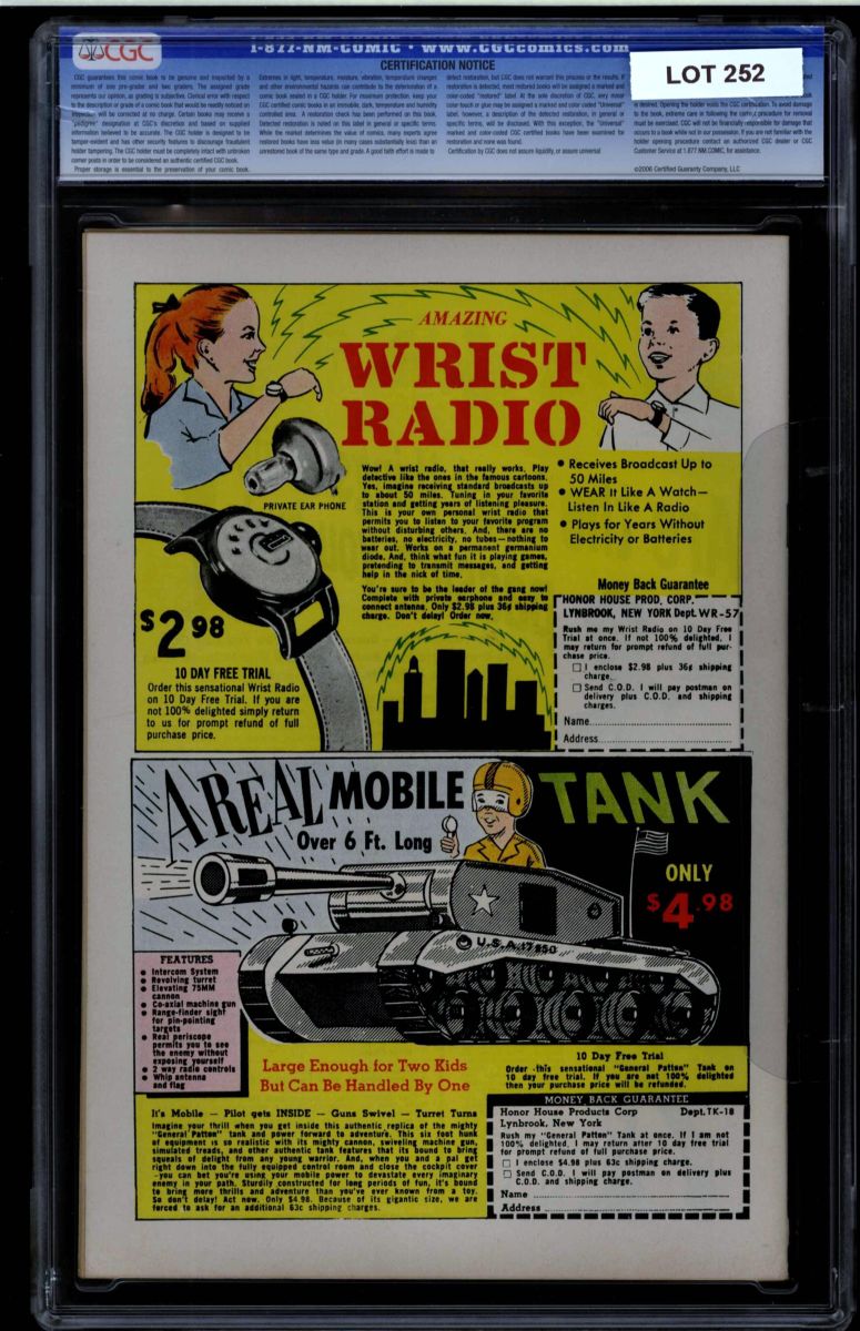 The Auctioneer has reserved the right to reject any and all bids, and to bid at the auction. Auctioneers Auctions are not on approval. Auctioneer does not allow certified material to be returned because of possible differences of opinion with respect to the grade offered by any third party organization, dealer, or service. Absolutely no guarantee of grade is offered for un-certified property sold and subsequently submitted to a third-party grading service. There will be no exceptions to this policy. Under extremely limited circumstances, (e.g. gross cataloging error) a purchaser, who did not bid from the floor, may request Auctioneer to evaluate voiding a sale; such request must be made in writing detailing the alleged gross error, and submission of the lot to the Auctioneer must be pre-approved by the Auctioneer. Bidder must notify Auctioneer in writing of such request within three (3) days of the non-floor bidder receipt of the lot. Any lot that is to be evaluated must be in our offices within 30 days after Auction. Grading does not qualify for this evaluation process nor do such complaints constitute a basis to challenge the authenticity of a lot. AFTER THAT 30-DAY PERIOD, NO LOTS MAY BE RETURNED FOR REASONS OTHER THAN AUTHENTICITY. Lots returned must be housed intact in the original holder. No lots purchased by floor Bidders may be returned (including those Bidders acting as agents for others). Late remittance for purchases may be considered just cause to revoke all return privileges. B: Auctions conducted solely on the Internet have a THREE (3) DAY RETURN POLICY: Lots paid for within seven days of the Auction closing are sold with a three (3) day return privilege. You may return lots under the following conditions: Within three days of receipt of the lot, you must first notify Auctioneer by contacting Client Service by phone (314-680-8599) or e-mail (moundcityauctions@gmail.com), and immediately mail the lot(s) fully insured to the attention of Returns, Mound City Auctions 1081 Teson Rd. Hazelwood, MO. 63042. Lots must be housed intact in their original holder and in their original condition. You are responsible for the insured, safe delivery of any lots. Auctioneer will not be responsible for lots returned in non-registered mail or lots returned without prior authorization per section B. A non-negotiable return fee of 5% of the purchase price ($10 per lot minimum) will be deducted from the refund for each returned lot or billed directly. Postage and handling fees are not refunded. After the three-day period (from receipt), no items may be returned for any reason. Late remittance for purchases revokes all Return-Restock privileges. C: Bidders who have inspected the lots prior to the auction will not be granted any return privileges. D: Comic books sold referencing a third-party grading service are sold “as is” without any express or implied warranty. Certain warranties may be available from the grading services and the Bidder is referred to them for further details: Certified Guaranty Company, LLC. (CGC), P.O. Box 4738, Sarasota, FL 34230. E: Bidders who intend to challenge authenticity or provenance of a lot must notify Auctioneer in writing within thirty (30) days of the Auctions conclusion. In the event Auctioneer cannot deliver the lot or subsequently it is established that the lot lacks title, provenance, authenticity, or other transfer or condition issue is claimed, Auctioneer's liability shall be limited to rescission of sale and refund of purchase price; in no case shall Auctioneer's maximum liability exceed the high bid on that lot, which bid shall be deemed for all purposes the value of the lot. After one year has elapsed, Auctioneer's maximum liability shall be limited to any commissions and fees Auctioneer earned on that lot. F: All comics are guaranteed genuine, but are not guaranteed as to grade, since grading is a matter of opinion, an art and not a science, and therefore the opinion rendered by the Auctioneer or any third party grading service may not agree with the opinion of others (including trained experts), and the same expert may not grade the same item with the same grade at two different times. G: Since we cannot examine encapsulated comics, they are sold “as is”without our grading opinion, and may not be returned for any reason. Auctioneer shall not be liable for any patent or latent defect or controversy pertaining to or arising from any encapsulated collectible. In any such instance, purchaser's remedy, if any, shall be solely against the service certifying the collectible. H: Due to changing grading standards over time, differing interpretations, and to possible mishandling of items by subsequent owners, Auctioneer reserves the right to grade items differently than shown on certificates from any grading service that accompany the items. Auctioneer also reserves the right to grade items differently than the grades shown in the prior catalog should such items be reconsigned to any future auction. I: Although consensus grading is employed by most grading services, it should be noted as aforesaid that grading is not an exact science. In fact, it is entirely possible that if a lot is broken out of a plastic holder and resubmitted to another grading service or even to the same service, the lot could come back with a different grade assigned. J: Certification does not guarantee protection against the normal risks associated with potentially volatile markets. The degree of liquidity for certified collectibles will vary according to general market conditions and the particular lot involved. For some lots there may be no active market at all at certain points in time."