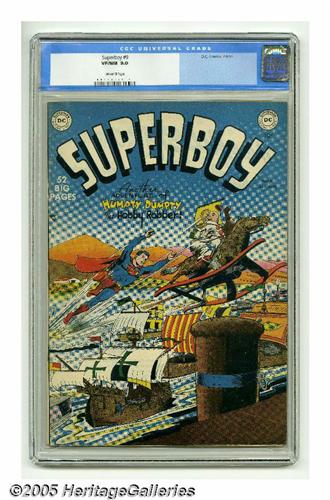 <B>Superboy #9 (DC, 1950) CGC VF/NM 9.0 Off-white pages.</B></I> The Boy of Steel comes up against the bizarre "Humpty Dumpty, the Hobby Robber" in this issue. The cover illustration, featuring wooden ships with colorful sails set against a background of blue, orange, and pink, is lovely, as is the overall condition of the book. Finding high-grade examples of DC superhero comics from this period can be tough; here's one as nice as they come. Overstreet 2005 VF/NM 9.0 value = $907; NM- 9.2 value = $1,225. CGC census 6/05: 1 in 9.0, none higher.