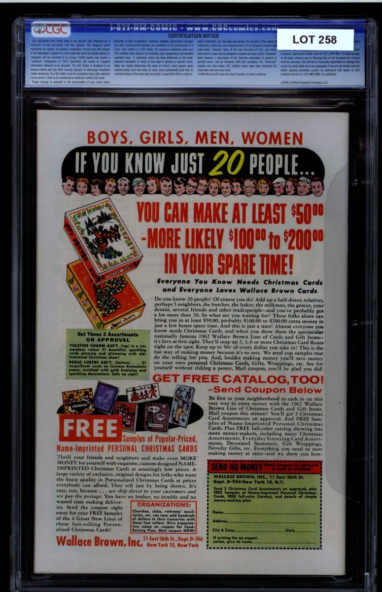 The Auctioneer has reserved the right to reject any and all bids, and to bid at the auction. Auctioneers Auctions are not on approval. Auctioneer does not allow certified material to be returned because of possible differences of opinion with respect to the grade offered by any third party organization, dealer, or service. Absolutely no guarantee of grade is offered for un-certified property sold and subsequently submitted to a third-party grading service. There will be no exceptions to this policy. Under extremely limited circumstances, (e.g. gross cataloging error) a purchaser, who did not bid from the floor, may request Auctioneer to evaluate voiding a sale; such request must be made in writing detailing the alleged gross error, and submission of the lot to the Auctioneer must be pre-approved by the Auctioneer. Bidder must notify Auctioneer in writing of such request within three (3) days of the non-floor bidder receipt of the lot. Any lot that is to be evaluated must be in our offices within 30 days after Auction. Grading does not qualify for this evaluation process nor do such complaints constitute a basis to challenge the authenticity of a lot. AFTER THAT 30-DAY PERIOD, NO LOTS MAY BE RETURNED FOR REASONS OTHER THAN AUTHENTICITY. Lots returned must be housed intact in the original holder. No lots purchased by floor Bidders may be returned (including those Bidders acting as agents for others). Late remittance for purchases may be considered just cause to revoke all return privileges. B: Auctions conducted solely on the Internet have a THREE (3) DAY RETURN POLICY: Lots paid for within seven days of the Auction closing are sold with a three (3) day return privilege. You may return lots under the following conditions: Within three days of receipt of the lot, you must first notify Auctioneer by contacting Client Service by phone (314-680-8599) or e-mail (moundcityauctions@gmail.com), and immediately mail the lot(s) fully insured to the attention of Returns, Mound City Auctions 1081 Teson Rd. Hazelwood, MO. 63042. Lots must be housed intact in their original holder and in their original condition. You are responsible for the insured, safe delivery of any lots. Auctioneer will not be responsible for lots returned in non-registered mail or lots returned without prior authorization per section B. A non-negotiable return fee of 5% of the purchase price ($10 per lot minimum) will be deducted from the refund for each returned lot or billed directly. Postage and handling fees are not refunded. After the three-day period (from receipt), no items may be returned for any reason. Late remittance for purchases revokes all Return-Restock privileges. C: Bidders who have inspected the lots prior to the auction will not be granted any return privileges. D: Comic books sold referencing a third-party grading service are sold “as is” without any express or implied warranty. Certain warranties may be available from the grading services and the Bidder is referred to them for further details: Certified Guaranty Company, LLC. (CGC), P.O. Box 4738, Sarasota, FL 34230. E: Bidders who intend to challenge authenticity or provenance of a lot must notify Auctioneer in writing within thirty (30) days of the Auctions conclusion. In the event Auctioneer cannot deliver the lot or subsequently it is established that the lot lacks title, provenance, authenticity, or other transfer or condition issue is claimed, Auctioneer's liability shall be limited to rescission of sale and refund of purchase price; in no case shall Auctioneer's maximum liability exceed the high bid on that lot, which bid shall be deemed for all purposes the value of the lot. After one year has elapsed, Auctioneer's maximum liability shall be limited to any commissions and fees Auctioneer earned on that lot. F: All comics are guaranteed genuine, but are not guaranteed as to grade, since grading is a matter of opinion, an art and not a science, and therefore the opinion rendered by the Auctioneer or any third party grading service may not agree with the opinion of others (including trained experts), and the same expert may not grade the same item with the same grade at two different times. G: Since we cannot examine encapsulated comics, they are sold “as is”without our grading opinion, and may not be returned for any reason. Auctioneer shall not be liable for any patent or latent defect or controversy pertaining to or arising from any encapsulated collectible. In any such instance, purchaser's remedy, if any, shall be solely against the service certifying the collectible. H: Due to changing grading standards over time, differing interpretations, and to possible mishandling of items by subsequent owners, Auctioneer reserves the right to grade items differently than shown on certificates from any grading service that accompany the items. Auctioneer also reserves the right to grade items differently than the grades shown in the prior catalog should such items be reconsigned to any future auction. I: Although consensus grading is employed by most grading services, it should be noted as aforesaid that grading is not an exact science. In fact, it is entirely possible that if a lot is broken out of a plastic holder and resubmitted to another grading service or even to the same service, the lot could come back with a different grade assigned. J: Certification does not guarantee protection against the normal risks associated with potentially volatile markets. The degree of liquidity for certified collectibles will vary according to general market conditions and the particular lot involved. For some lots there may be no active market at all at certain points in time."