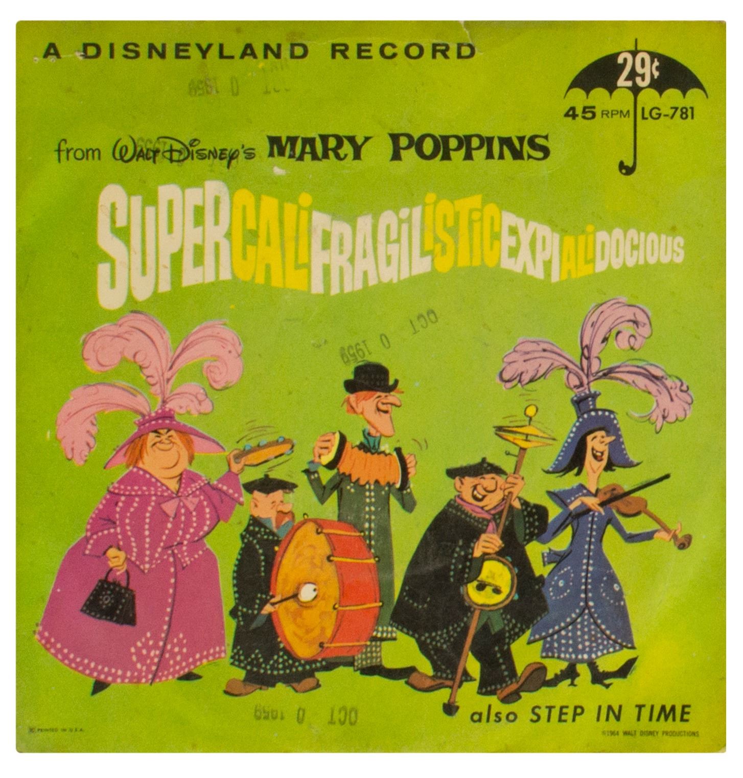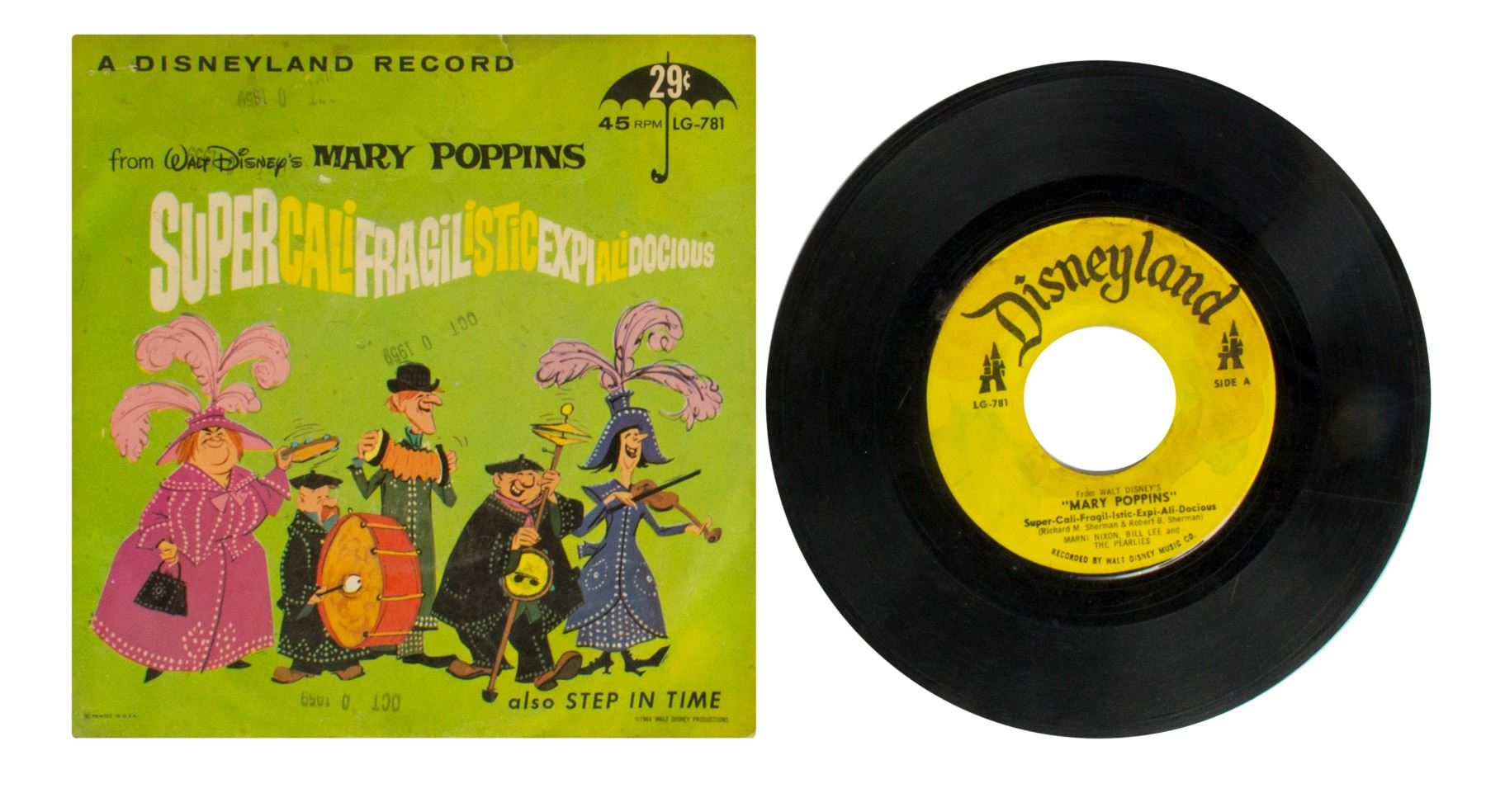 (Disney, 1964) A souvenir Disneyland 45rpm record titled "Supercalifragilisticexpialidocious" featuring songs from Walt Disney's "Mary Poppins". The double-sided record plays both the title song, as well as "Step in Time". The album cover measure 7.25"x7.25" and the condition is good with some surface scratches and wear to the vinyl from use, as well as some date stamps on the album cover. There is a name label from the original owner as well as some discoloration to the yellow Disneyland record label.