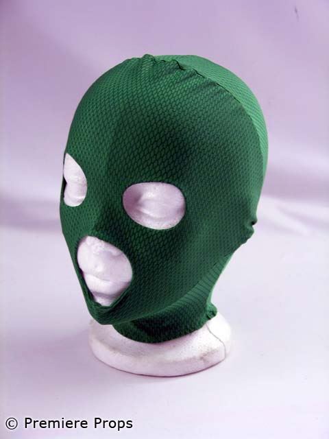 Rick Riker (Drake Bell) screen worn, hero green and black w/ black dragonfly on front zip up the back dragonfly superhero shirt, green and black spandex dragonfly superhero pants, green mask. Includes wardrobe tags.