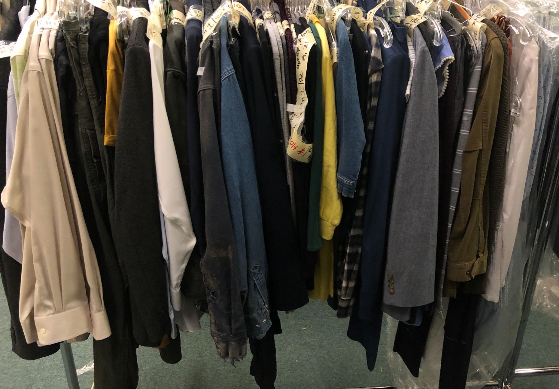 "Superhero Show" - S4 - Rack of assorted Hero screen worn wardrobe from S4 - includes denim jackets / shirts / joggers / pants / scrubs etc (approx 85 pcs)