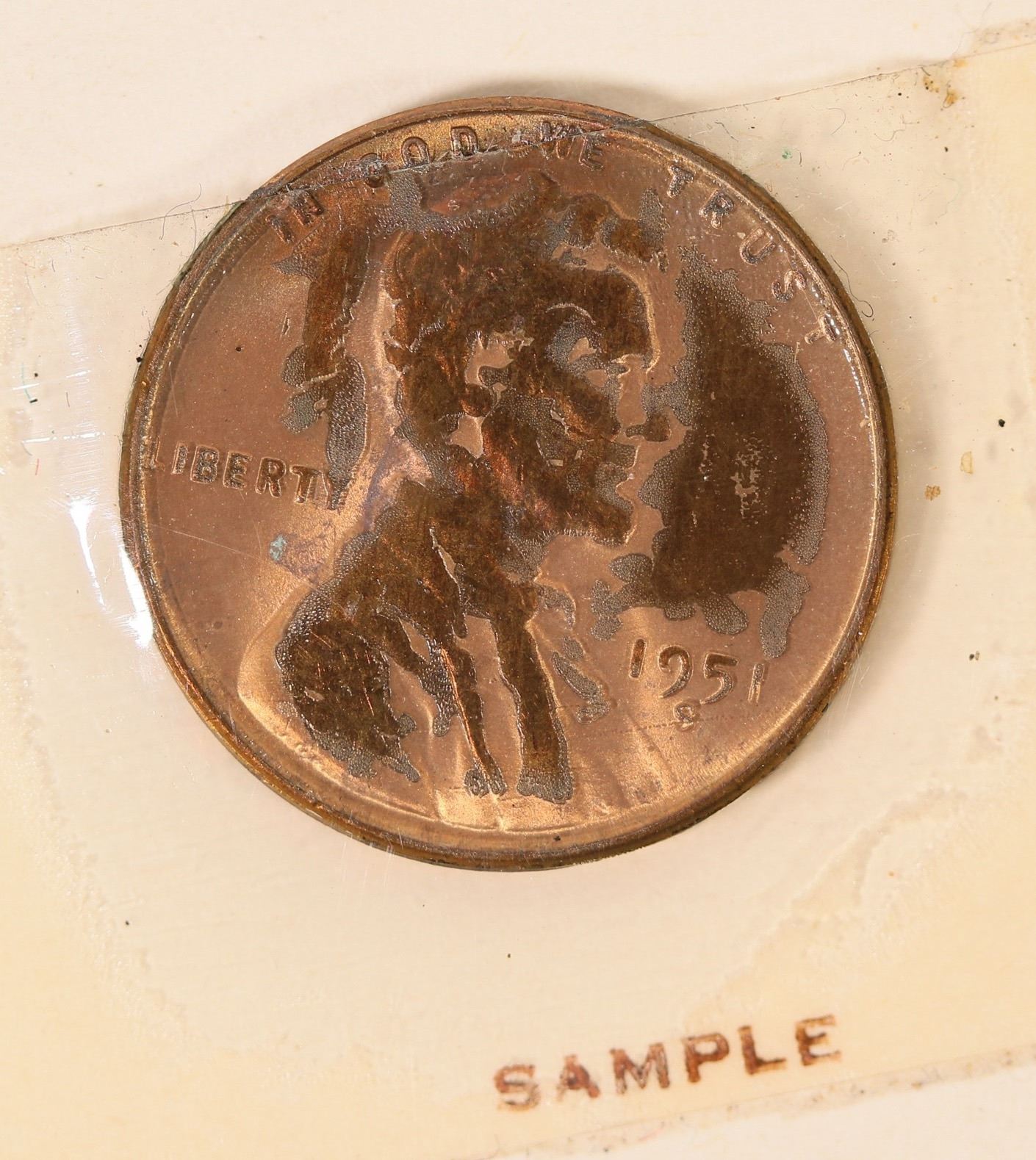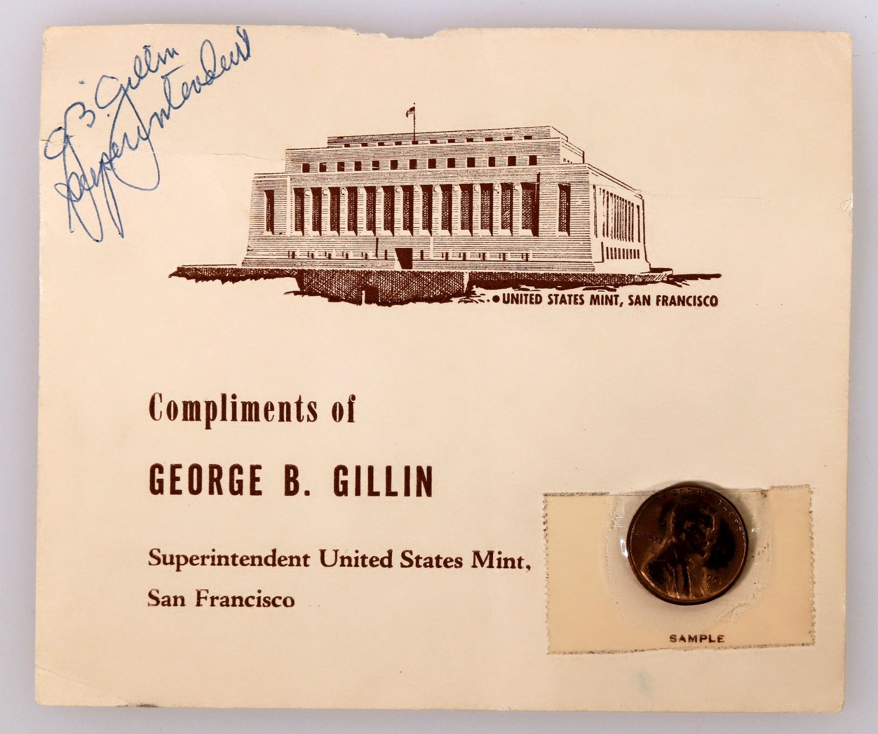 Compliments of George B. Gillin, Superintendent United States Mint, San Francisco. 4 x 5 inch paper with photo of the United States Mint and autographed upper left corner, with 1951-S Lincoln cent taped to the card.