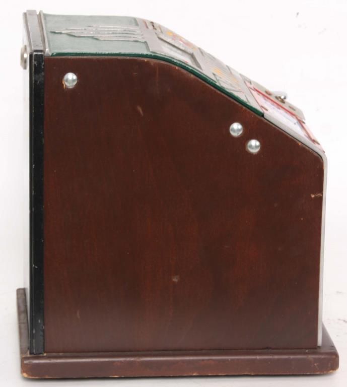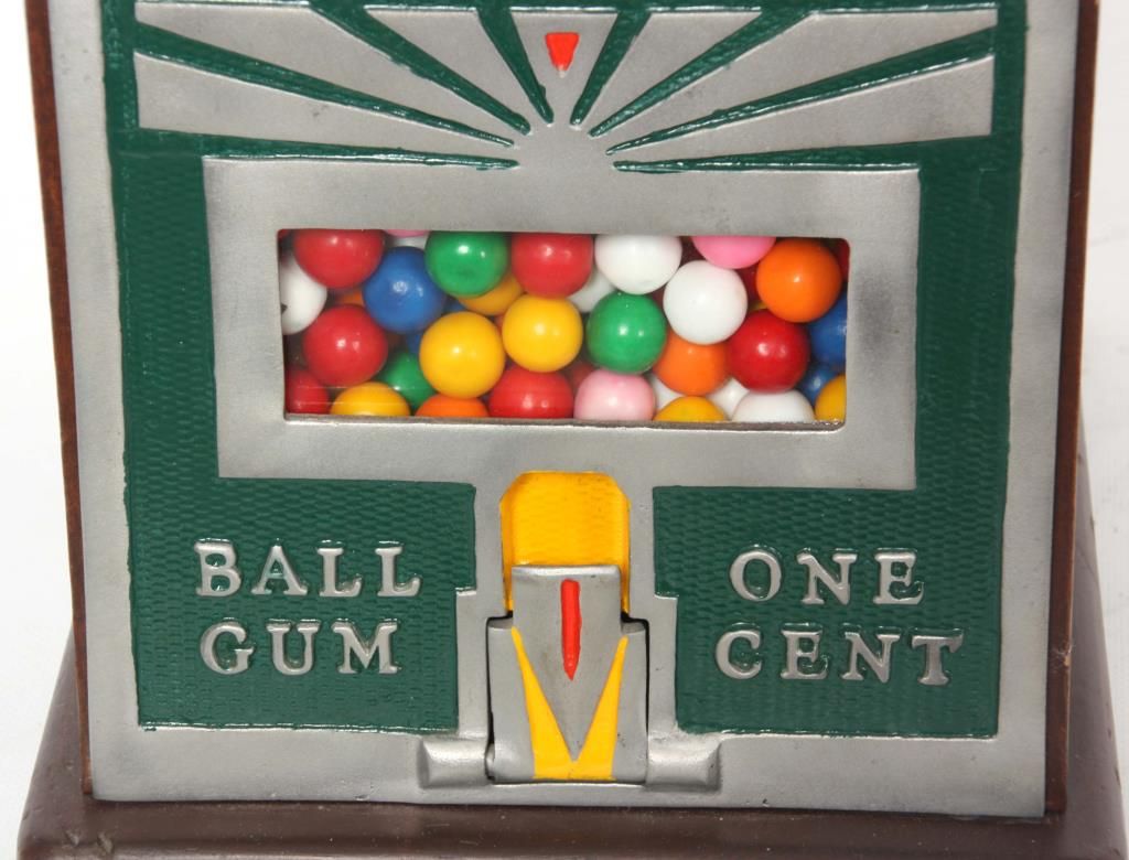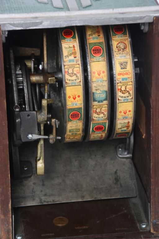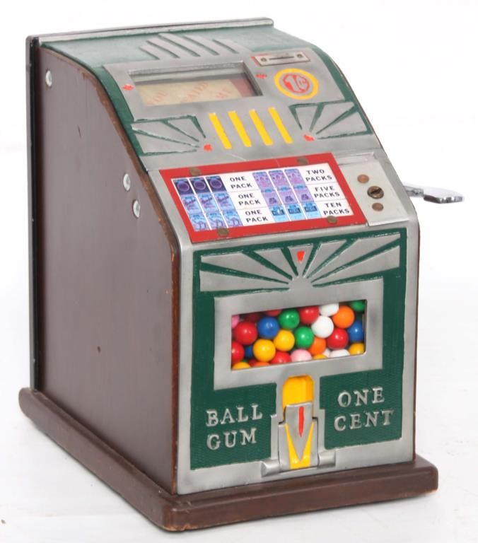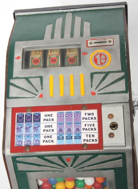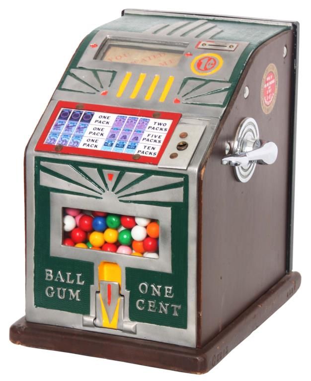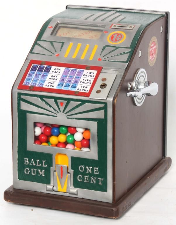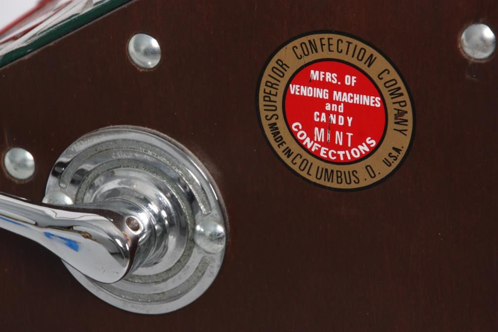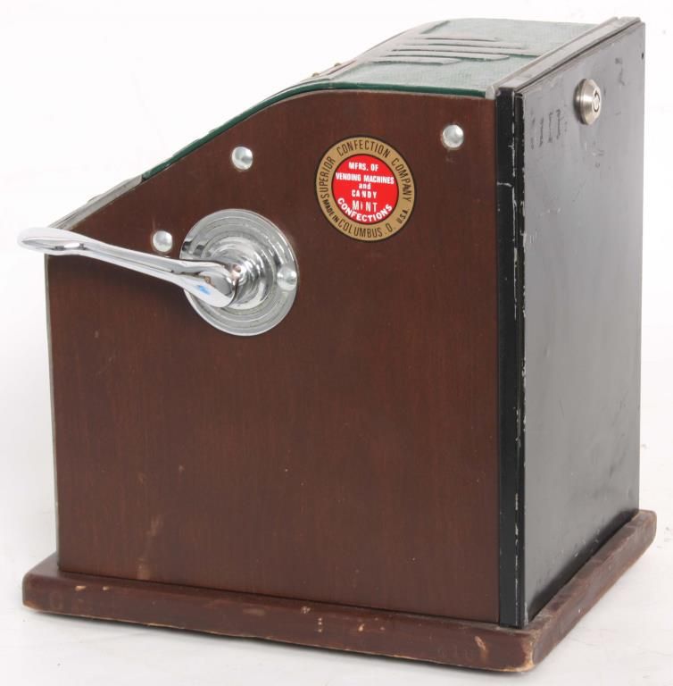 Superior Confection Co. 1 Cent Trade Stimulator. Metal front is painted green with yellow and orange highlights, wood sides with a decal for Superior Confection Company, Columbus, O. U.S.A; the reels have printed papers with various cigarette advertisements; 1 cent machine dispenses a gumball for each play and a winning spin is rewarded with cigarette packs. 11.5 in. high x 9 in. wide x 11 in. deep.