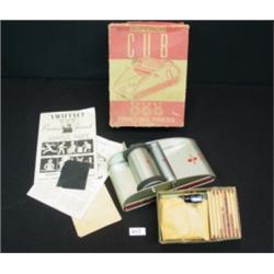 Superior Cub Rotary Printing Press #8401 in original box, complete with ink bottle and rubber type. Great printing collectible-one end of box is taped over a tear, box is rough.
