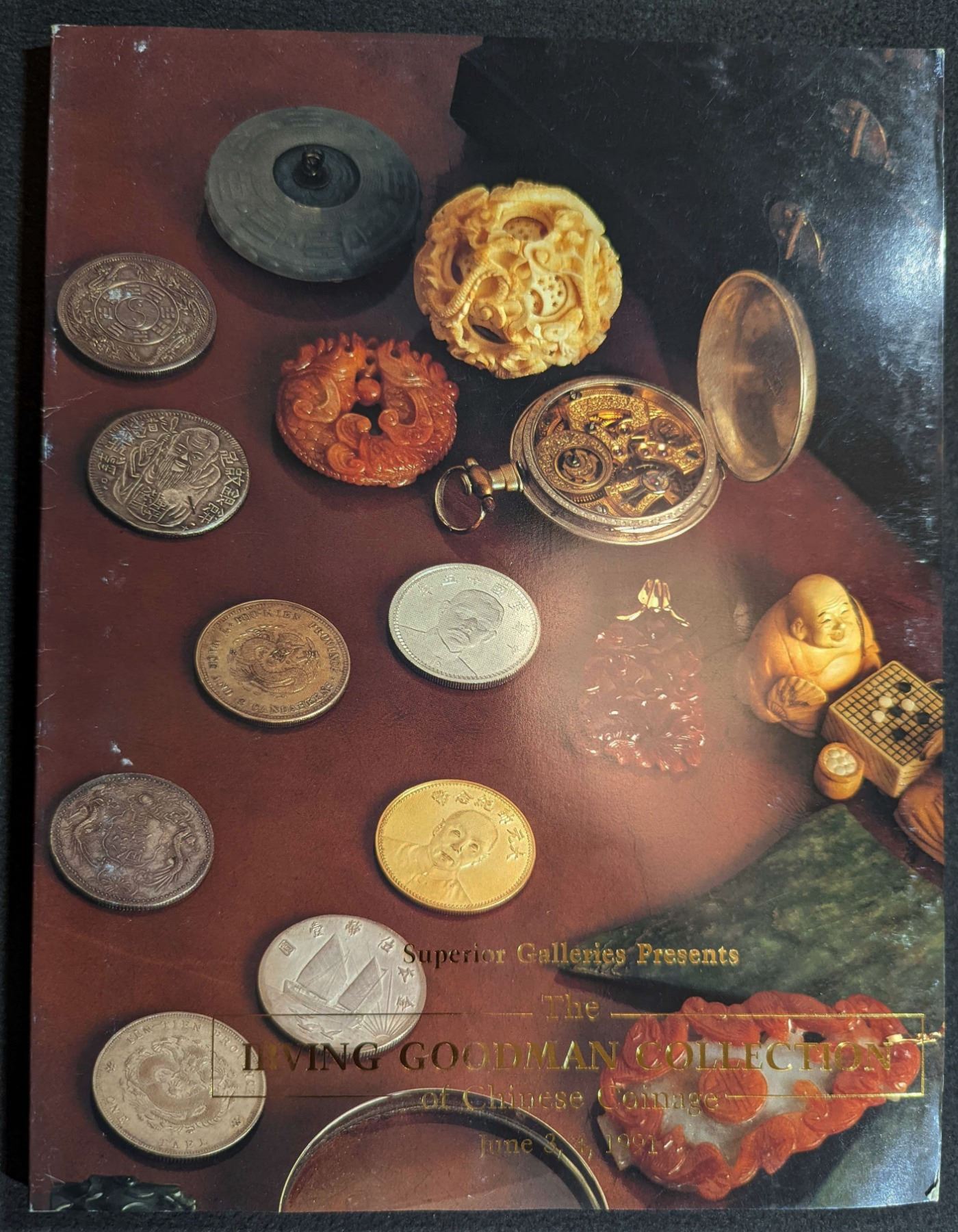 Superior Galleries, Inc. THE IRVING GOODMAN COLLECTION OF CHINESE COINAGE. June 3-4, 1991. 1-2105 Lots. 4to. This catalog presents numismatic material from China, solely dedicated to the Irving Goodman Collection of Chinese coinage. Sections of the Goodman Collection include Gold coinage, China's First Silver Dollar Coinage, Imperial Coins of the Dragon Design, Chinese 'Errors' and 'Mules', Republican Coinage, Fantasy Collection, Medallions, Silver Taels of China, Imperial Issues, Tibetan and Nepal Silver Coinage, Annam, and Silver Sycee. Beverly Hills. Original pictorial card covers. 5 color plates, b&w plated throughout. Fine. One of the most important and scarce sales of Chinese coinage, Gengerke 95[621]. Lot weight: 1 lbs 3oz. Subject(s): Chinese Coinage.