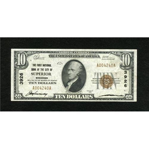 <B>Superior, WI</B></I> - $10 1929 Ty. 1 <B>The First NB of the City of Superior</B></I> Ch. # 3926<BR>A crackling fresh <B>Extremely Fine</B></I> that is a new high serial in the census for this type and denomination from this Douglas County locale on Lake Superior. An especially appealing note, with nice margins, bright color and fresh original paper surfaces. The several folds are quite faint.<BR><BR><b>Shipping:</b> Coins & Currency (<a target="_blank" href="http://www.heritageauctions.com/common/shipping.php">view shipping information</a>)