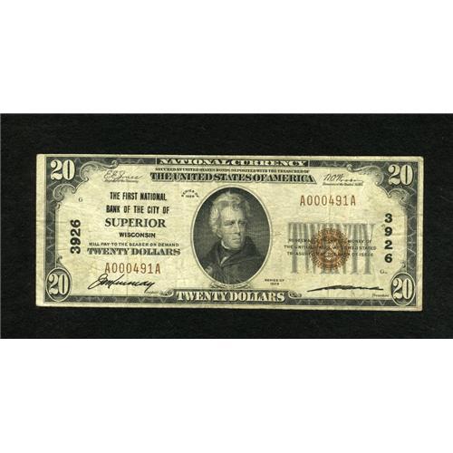 <B>Superior, WI</B></I> - $20 1929 Ty. 1 <B>The First NB of the City of Superior</B></I> Ch. # 3926<BR>A nice evenly circulated <B>Fine-Very Fine</B></I> example with no problems whatsoever.<BR><BR><b>Shipping:</b> Coins & Currency (<a target="_blank" href="http://www.heritageauctions.com/common/shipping.php">view shipping information</a>)