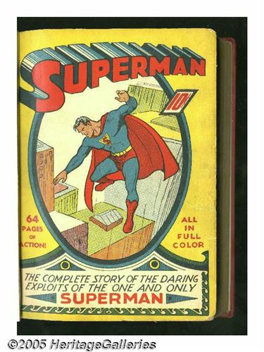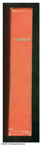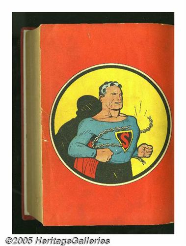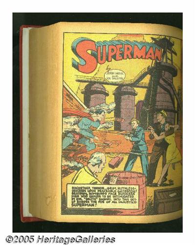 <B>Superman #1-7 Plus Early Action Comics Bound Volume (DC, 1939).</B></I> This bound volume not only includes <B>Superman</B></I> #1, 2, 3, 4, 5, 6, and 7 (each of which had four Superman stories), but also the Superman stories from <B>Action Comics</B></I> #14, 15, 16, 17, 18, 20, 24, 26, 28, 29, 30, and 31 (without the backup features starring other characters) -- that's 40 Superman stories in all from 1939 and 1940! The only covers included are the front and back covers of Superman #1, which are in GD/VG condition. Tan edges, some one-inch tears in a handful of pages, and minor (1/4-inch) tears here and there, sometimes repaired with an unobtrusive piece of tape, are the only indications of the ravages of time and many re-readings, so there's nothing to deter your reading pleasure some 66 years later! This amazing bound volume would be well worth having for <B>Superman</B></I> #1 alone, which is the fourth most valuable comic book of all according to Overstreet! Finding and acquiring all of the individual comics would be quite a chore, and an extremely expensive one at that. Being able to page through the original stories like kids in 1939 did is quite a thrill that reprints can't come close to matching.