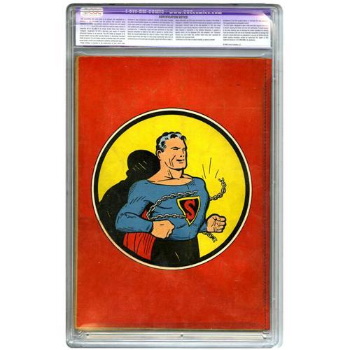 <B>Superman #1 (DC, 1939) CGC Apparent VG/FN 5.0 Extensive (P) Cream to off-white pages.</B></I> Not only is this one of the five most <I>valuable</B></I> comic issues ever published, it's one of the most <I>significant</B></I> comics ever published as well. At a time when all comics were either newspaper-strip reprints, cartoon-character vehicles, or anthology titles like <B>Action</B></I> or <B>Detective</B></I>, this series devoted an entire comic to a character who was created for the comic book medium... and this new series was a huge success! The famous cover is by Superman's co-creator Joe Shuster. To get an idea of how this book electrified kids of the time, just ask Ron Seawright, who bought this very copy at a drugstore in Hermosa Beach, CA as a young boy in 1939: "A friend of the family told me excitedly about 'a new comic that just came out about a strong man with a cape who could fly, jump over buildings, lift cars and everything'," he says, "back then they didn't have a word for superhero." A few years later, the patriotic youngster, whose father was in the service, did what he could for the war effort by taking his comic collection to donate to a USO paper drive, even parting with his <B>Detective Comics</B></I> #27. But Mr. Seawright, now 72, told us to pass this on to our bidders: "I didn't donate my <B>Superman</B></I> comics to the USO... I saved them for <I>you</B></I>." CGC notes, "Restoration includes: color touch, pieces added, tear seals, cleaned, reinforced." Overstreet 2006 GD 2.0 value = $18,250; VG 4.0 value = $36,500; FN 6.0 value = $54,750.