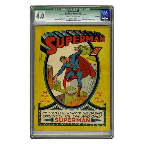 <B>Superman #1 (DC, 1939) CGC Qualified VG 4.0 Cream to off-white pages.</B></I> This first issue is tougher to find than almost any other DC #1, and there are lots of reasons why lots of people would love to have one. Overstreet called it "Arguably the second most important comic ever published (<B>Action</B></I> being the first) ... (it) demonstrated to the industry that it could survive on its own original material, independent of the proven syndicated stars." This first issue reprinted Superman's first four <B>Action</B></I> stories, but also added some new material. It's the fourth most valuable comic book in Overstreet's ranking. CGC notes, "Coupon cut out of centerfold, does not affect story. Incomplete." Overstreet 2005 GD 2.0 value = $17,250; VG 4.0 value = $34,500.