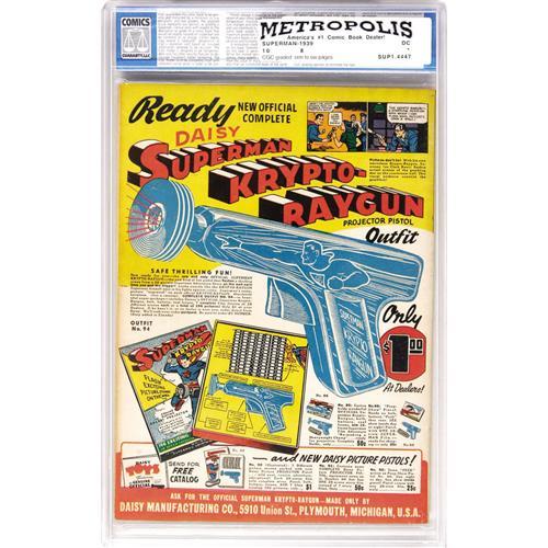 <B>Superman #10 (DC, 1941) CGC VF 8.0 Cream to off-white pages.</B></I> Co-creator Joe Shuster is understandably the artist primarily associated with the earliest issues of this title, but Fred Ray actually was responsible for more covers during the first 20 issues, including this one. On a more fashion-oriented note, Lex Luthor makes his fifth appearance here, and his first without hair, a look that he's maintained to this day. (Way to stick with a hairstyle, Lex.) CGC notes, "Name stamp on interior cover. Moderate tanning to interior front and back covers." Overstreet 2006 VF 8.0 value = $1,994. CGC census 7/06: 3 in 8.0, 6 higher. <BR><BR><B>Important notice:</B> Heritage usually auctions material at the rate of 200-250 lots per hour. On some occasions eBay Live bid software or the Internet may not be able to keep up with the pace of the auction. We recommend placing a realistic absentee bid now as insurance to avoid disappointment. Occasionally the auctioneer may eliminate or reject an eBay Live bid, and the auctioneer may also reopen a lot after the close of the eBay live bidding (usually because we missed an audience bid), and may reject your bid even if it shows you as the winning bidder. By bidding via eBay Live, you agree that Heritage may award the lot to another bidder at its sole discretion under the circumstances described above or any other reasonable circumstances. Since eBay bids are not shown to us until we open the lot on the floor, we treat those bids just like floor bids. In most cases the floor responds before the eBay bid is presented to us, due to Internet lag time, so for consistency we have made it a policy that floor bids are always considered first over tie eBay live bids. Also please note that all Heritage lots purchased through eBay Live carry a 22.5% Buyer's Premium. Please make sure you read the Terms and Conditions before you bid. This lot is being auctioned in conjunction with a live floor auction by Heritage Auction Galleries. All final auction and invoice information will be supplied by Heritage Auction Galleries, and all other information should be considered preliminary. Lot:41001 <BR><BR><B>Winning Notification and Billing:</B> After the FINAL session in this auction is complete, Heritage will send e-mail and snail mail invoices. This process normally takes several days. All final auction and invoice information will be supplied by Heritage Auction Galleries, and all other information should be considered preliminary. <BR><BR>This auction will be conducted on a live auction floor and over the Internet through eBay Live. If you choose to place an absentee bid, please take a moment to <font color='#0000ff'><u><a href='http://pages.ebay.com/liveauctions/help/before/laabsentee.html'>learn how eBay Live absentee bidding works</a></u></font><font color='#000000'>