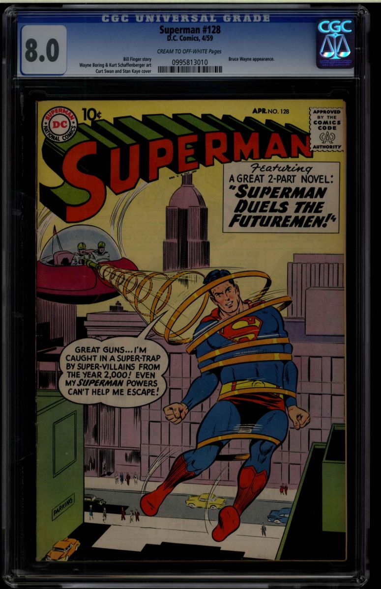 Superman #128 CGC 8.0 cream to off-white pages. Bill Finger story, Wayne Boring & Kurt Schaffenberger art. Curt Swan and Stan Kaye cover. Bruce Wayne appearance. Overstreet 2009 VF 8.0 value = $226. CGC census: 1 at 8.0, 2 higher.