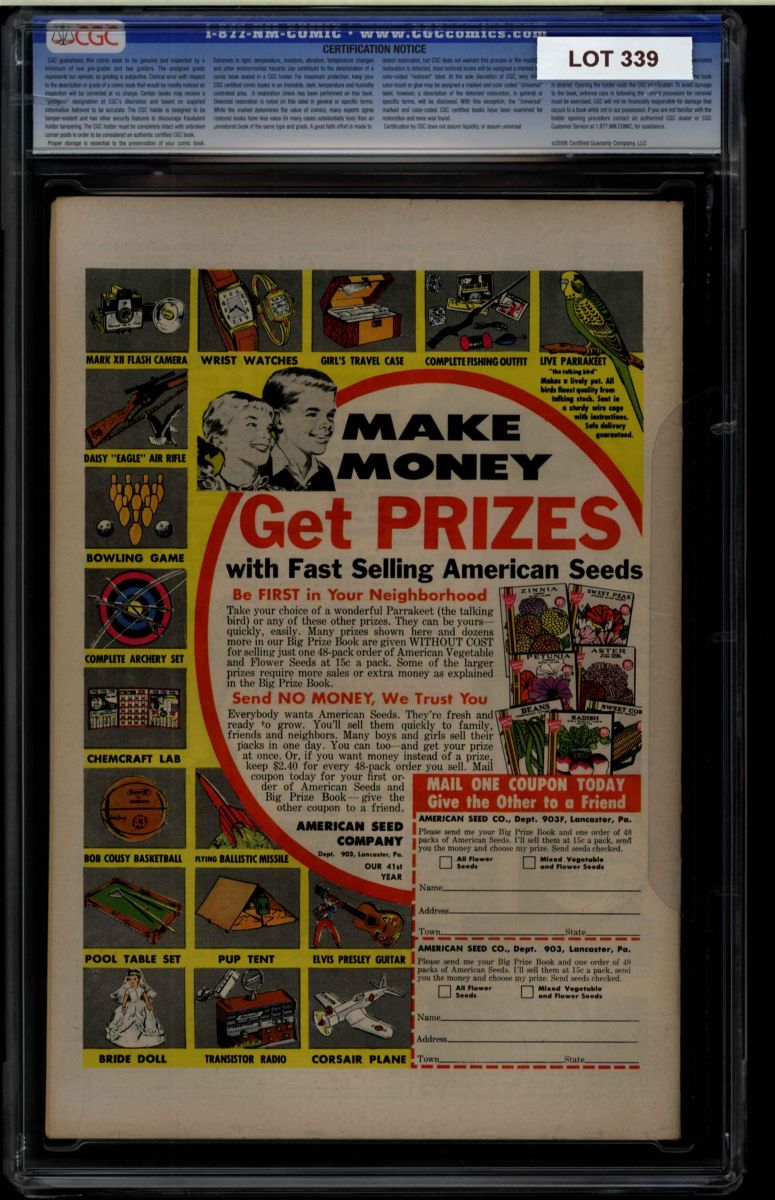 The Auctioneer has reserved the right to reject any and all bids, and to bid at the auction. Auctioneers Auctions are not on approval. Auctioneer does not allow certified material to be returned because of possible differences of opinion with respect to the grade offered by any third party organization, dealer, or service. Absolutely no guarantee of grade is offered for un-certified property sold and subsequently submitted to a third-party grading service. There will be no exceptions to this policy. Under extremely limited circumstances, (e.g. gross cataloging error) a purchaser, who did not bid from the floor, may request Auctioneer to evaluate voiding a sale; such request must be made in writing detailing the alleged gross error, and submission of the lot to the Auctioneer must be pre-approved by the Auctioneer. Bidder must notify Auctioneer in writing of such request within three (3) days of the non-floor bidder receipt of the lot. Any lot that is to be evaluated must be in our offices within 30 days after Auction. Grading does not qualify for this evaluation process nor do such complaints constitute a basis to challenge the authenticity of a lot. AFTER THAT 30-DAY PERIOD, NO LOTS MAY BE RETURNED FOR REASONS OTHER THAN AUTHENTICITY. Lots returned must be housed intact in the original holder. No lots purchased by floor Bidders may be returned (including those Bidders acting as agents for others). Late remittance for purchases may be considered just cause to revoke all return privileges. B: Auctions conducted solely on the Internet have a THREE (3) DAY RETURN POLICY: Lots paid for within seven days of the Auction closing are sold with a three (3) day return privilege. You may return lots under the following conditions: Within three days of receipt of the lot, you must first notify Auctioneer by contacting Client Service by phone (314-680-8599) or e-mail (moundcityauctions@gmail.com), and immediately mail the lot(s) fully insured to the attention of Returns, Mound City Auctions 1081 Teson Rd. Hazelwood, MO. 63042. Lots must be housed intact in their original holder and in their original condition. You are responsible for the insured, safe delivery of any lots. Auctioneer will not be responsible for lots returned in non-registered mail or lots returned without prior authorization per section B. A non-negotiable return fee of 5% of the purchase price ($10 per lot minimum) will be deducted from the refund for each returned lot or billed directly. Postage and handling fees are not refunded. After the three-day period (from receipt), no items may be returned for any reason. Late remittance for purchases revokes all Return-Restock privileges. C: Bidders who have inspected the lots prior to the auction will not be granted any return privileges. D: Comic books sold referencing a third-party grading service are sold “as is” without any express or implied warranty. Certain warranties may be available from the grading services and the Bidder is referred to them for further details: Certified Guaranty Company, LLC. (CGC), P.O. Box 4738, Sarasota, FL 34230. E: Bidders who intend to challenge authenticity or provenance of a lot must notify Auctioneer in writing within thirty (30) days of the Auctions conclusion. In the event Auctioneer cannot deliver the lot or subsequently it is established that the lot lacks title, provenance, authenticity, or other transfer or condition issue is claimed, Auctioneer's liability shall be limited to rescission of sale and refund of purchase price; in no case shall Auctioneer's maximum liability exceed the high bid on that lot, which bid shall be deemed for all purposes the value of the lot. After one year has elapsed, Auctioneer's maximum liability shall be limited to any commissions and fees Auctioneer earned on that lot. F: All comics are guaranteed genuine, but are not guaranteed as to grade, since grading is a matter of opinion, an art and not a science, and therefore the opinion rendered by the Auctioneer or any third party grading service may not agree with the opinion of others (including trained experts), and the same expert may not grade the same item with the same grade at two different times. G: Since we cannot examine encapsulated comics, they are sold “as is”without our grading opinion, and may not be returned for any reason. Auctioneer shall not be liable for any patent or latent defect or controversy pertaining to or arising from any encapsulated collectible. In any such instance, purchaser's remedy, if any, shall be solely against the service certifying the collectible. H: Due to changing grading standards over time, differing interpretations, and to possible mishandling of items by subsequent owners, Auctioneer reserves the right to grade items differently than shown on certificates from any grading service that accompany the items. Auctioneer also reserves the right to grade items differently than the grades shown in the prior catalog should such items be reconsigned to any future auction. I: Although consensus grading is employed by most grading services, it should be noted as aforesaid that grading is not an exact science. In fact, it is entirely possible that if a lot is broken out of a plastic holder and resubmitted to another grading service or even to the same service, the lot could come back with a different grade assigned. J: Certification does not guarantee protection against the normal risks associated with potentially volatile markets. The degree of liquidity for certified collectibles will vary according to general market conditions and the particular lot involved. For some lots there may be no active market at all at certain points in time."