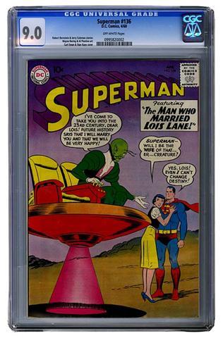 Superman #136 CGC 9.0 off-white pages. Robert Bernstein & Jerry Coleman stories. Wayne Boring & Al Plastino art. Curt Swan & Stan Kaye cover. Overstreet 2009 VF/NM 9.0 value = $265. CGC census: 1 at 9.0, 1 higher.