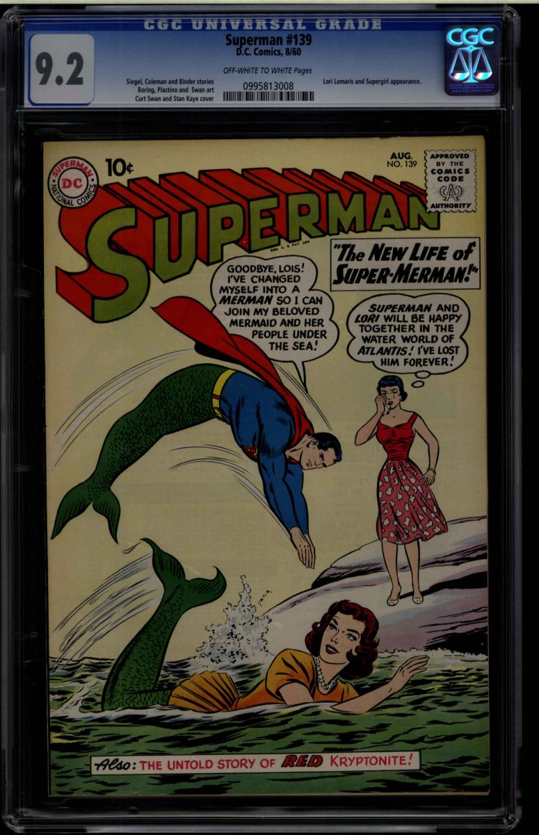 Superman #139 CGC 9.2 off-white to white pages. Siegel, Coleman and Binder stories. Boring, Plastino and Swan art. Curt Swan and Stan Kaye cover. Lori Lemaris and Supergirl appearance. Overstreet 2009 NM 9.2 value = $365. CGC census: 1 at 9.2, 1 higher.