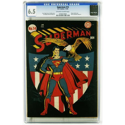 <B>Superman #14 (DC, 1942) CGC FN+ 6.5 Off-white to white pages.</B></I> This patriotic shield cover by Fred Ray is simply... well, the word "classic" gets bandied about quite a bit, but who could possibly dispute this being one of the very best of the patriotic cover genre? The book <B>Comics: Between The Panels</B></I> ranked it among the top ten comic book covers. An interior feature of note is a mermaid-themed story that far predated Lori Lemaris. This is a very solid mid-grade copy of this black-cover issue. Overstreet 2005 FN 6.0 value = $984; VF 8.0 value = $2,132. CGC census 11/05: 5 in 6.5, 10 higher.