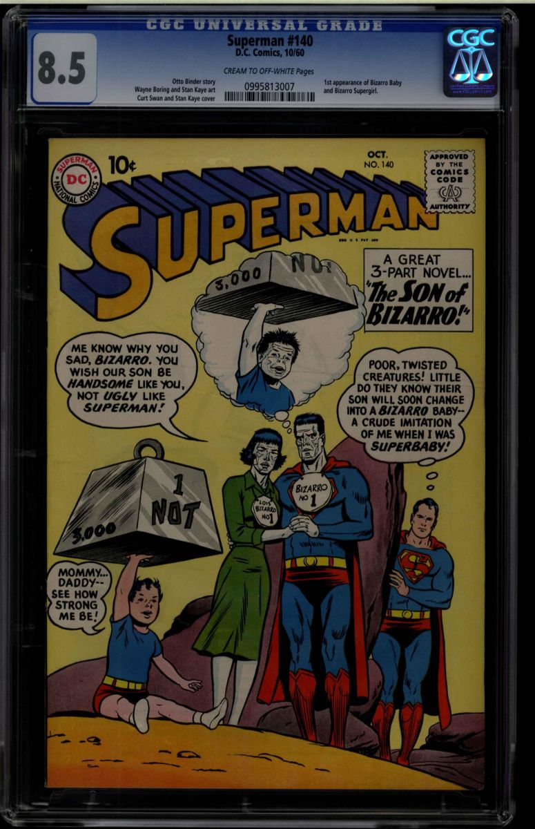 Superman #140 CGC 8.5 cream to off-white pages. Otto Binder story. Wayne Boring and Stan Kaye art. Curt Swan and Stan Kaye cover. 1st appearance of Bizarro Baby and Bizarro Supergirl. Overstreet 2009 VF 8.0 value = $169, VF/NM 9.0 value = $272. CGC census: 6 at 8.5, 6 higher.