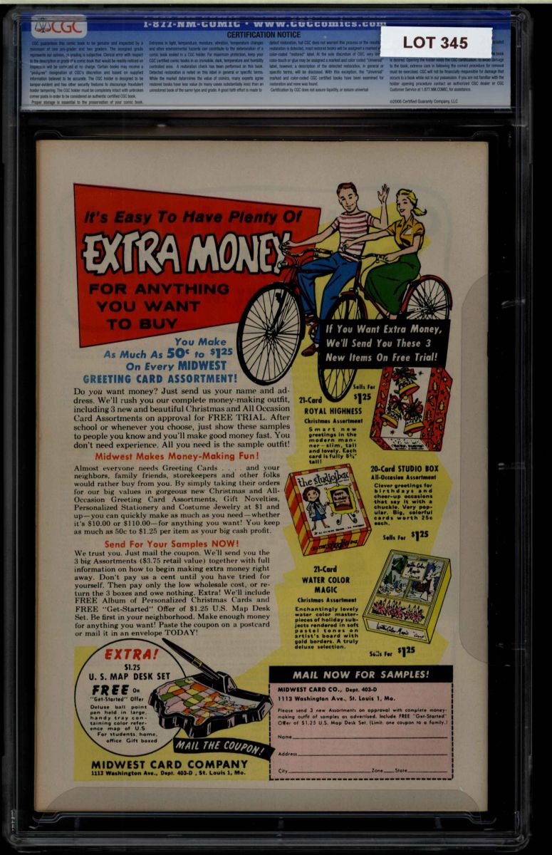 The Auctioneer has reserved the right to reject any and all bids, and to bid at the auction. Auctioneers Auctions are not on approval. Auctioneer does not allow certified material to be returned because of possible differences of opinion with respect to the grade offered by any third party organization, dealer, or service. Absolutely no guarantee of grade is offered for un-certified property sold and subsequently submitted to a third-party grading service. There will be no exceptions to this policy. Under extremely limited circumstances, (e.g. gross cataloging error) a purchaser, who did not bid from the floor, may request Auctioneer to evaluate voiding a sale; such request must be made in writing detailing the alleged gross error, and submission of the lot to the Auctioneer must be pre-approved by the Auctioneer. Bidder must notify Auctioneer in writing of such request within three (3) days of the non-floor bidder receipt of the lot. Any lot that is to be evaluated must be in our offices within 30 days after Auction. Grading does not qualify for this evaluation process nor do such complaints constitute a basis to challenge the authenticity of a lot. AFTER THAT 30-DAY PERIOD, NO LOTS MAY BE RETURNED FOR REASONS OTHER THAN AUTHENTICITY. Lots returned must be housed intact in the original holder. No lots purchased by floor Bidders may be returned (including those Bidders acting as agents for others). Late remittance for purchases may be considered just cause to revoke all return privileges. B: Auctions conducted solely on the Internet have a THREE (3) DAY RETURN POLICY: Lots paid for within seven days of the Auction closing are sold with a three (3) day return privilege. You may return lots under the following conditions: Within three days of receipt of the lot, you must first notify Auctioneer by contacting Client Service by phone (314-680-8599) or e-mail (moundcityauctions@gmail.com), and immediately mail the lot(s) fully insured to the attention of Returns, Mound City Auctions 1081 Teson Rd. Hazelwood, MO. 63042. Lots must be housed intact in their original holder and in their original condition. You are responsible for the insured, safe delivery of any lots. Auctioneer will not be responsible for lots returned in non-registered mail or lots returned without prior authorization per section B. A non-negotiable return fee of 5% of the purchase price ($10 per lot minimum) will be deducted from the refund for each returned lot or billed directly. Postage and handling fees are not refunded. After the three-day period (from receipt), no items may be returned for any reason. Late remittance for purchases revokes all Return-Restock privileges. C: Bidders who have inspected the lots prior to the auction will not be granted any return privileges. D: Comic books sold referencing a third-party grading service are sold “as is” without any express or implied warranty. Certain warranties may be available from the grading services and the Bidder is referred to them for further details: Certified Guaranty Company, LLC. (CGC), P.O. Box 4738, Sarasota, FL 34230. E: Bidders who intend to challenge authenticity or provenance of a lot must notify Auctioneer in writing within thirty (30) days of the Auctions conclusion. In the event Auctioneer cannot deliver the lot or subsequently it is established that the lot lacks title, provenance, authenticity, or other transfer or condition issue is claimed, Auctioneer's liability shall be limited to rescission of sale and refund of purchase price; in no case shall Auctioneer's maximum liability exceed the high bid on that lot, which bid shall be deemed for all purposes the value of the lot. After one year has elapsed, Auctioneer's maximum liability shall be limited to any commissions and fees Auctioneer earned on that lot. F: All comics are guaranteed genuine, but are not guaranteed as to grade, since grading is a matter of opinion, an art and not a science, and therefore the opinion rendered by the Auctioneer or any third party grading service may not agree with the opinion of others (including trained experts), and the same expert may not grade the same item with the same grade at two different times. G: Since we cannot examine encapsulated comics, they are sold “as is”without our grading opinion, and may not be returned for any reason. Auctioneer shall not be liable for any patent or latent defect or controversy pertaining to or arising from any encapsulated collectible. In any such instance, purchaser's remedy, if any, shall be solely against the service certifying the collectible. H: Due to changing grading standards over time, differing interpretations, and to possible mishandling of items by subsequent owners, Auctioneer reserves the right to grade items differently than shown on certificates from any grading service that accompany the items. Auctioneer also reserves the right to grade items differently than the grades shown in the prior catalog should such items be reconsigned to any future auction. I: Although consensus grading is employed by most grading services, it should be noted as aforesaid that grading is not an exact science. In fact, it is entirely possible that if a lot is broken out of a plastic holder and resubmitted to another grading service or even to the same service, the lot could come back with a different grade assigned. J: Certification does not guarantee protection against the normal risks associated with potentially volatile markets. The degree of liquidity for certified collectibles will vary according to general market conditions and the particular lot involved. For some lots there may be no active market at all at certain points in time."