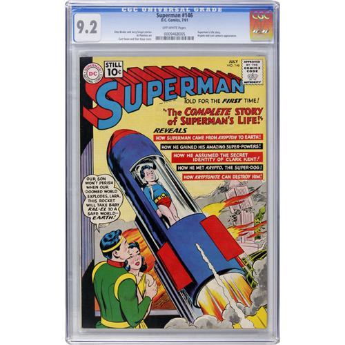 <B>Superman #146 (DC, 1961) CGC NM- 9.2 Off-white pages.</B></I> The last time a 9.2 copy of this issue was in one of our auctions, an all-out bidding melee broke out, with a winning bid of $1,553 taking the book home when all was said and done! This issue is important because it expanded considerably on Superman's origin, explaining more about why he has super powers. It also revealed tidbits like the reason Clark Kent's glasses never seem to get damaged (they're pieces of the rocket from Krypton that brought Superman to Earth). Overstreet notes that the backup feature hints at an Earth-Two, just a couple of months before more was revealed in <B>Flash</B></I> #123. Curt Swan drew the issue's cover, and Al Plastino penciled both interior stories. Overstreet 2006 NM- 9.2 value = $300. CGC census 3/07: 4 in 9.2, none higher. <I> From the Warren Hall Collection.</B></I><BR><BR><b>Shipping:</b> Comics - Slabbed (certified) (<a target="_blank" href="http://www.heritageauctions.com/common/shipping.php">view shipping information</a>)