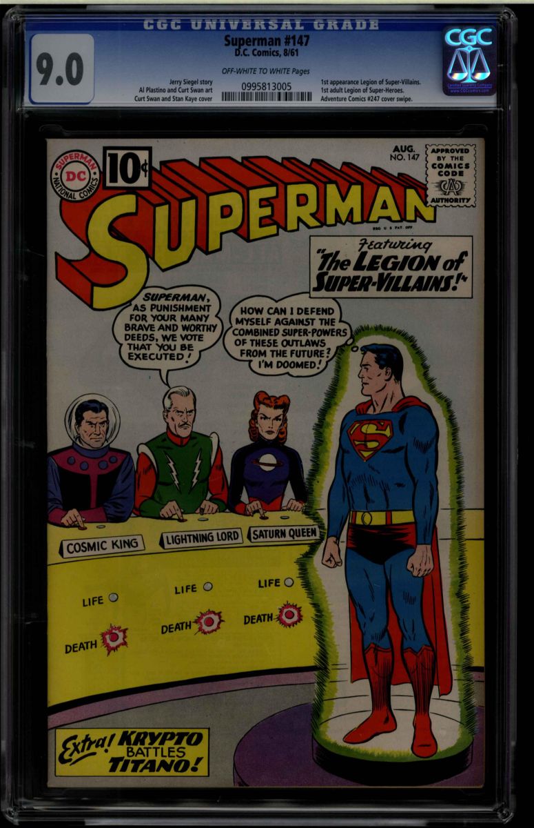Superman #147 CGC 9.0 off-white to white pages. Jerry Siegel story. Al Plastino and Curt Swan art. Curt Swan and Stan Kaye cover. 1st appearance of the Legion of Super-Villains. 1st adult Legion of Super-Heroes. Adventure Comics #247 cover swipe. Overstreet 2009 VF/NM 9.0 value = $280. CGC census: 1 at 9.0, 3 higher.