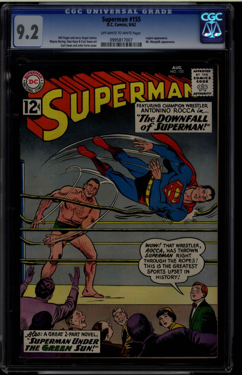 Superman #155 CGC 9.2 off-white to white pages. Bill Finger and Jerry Siegel stories. Wayne Boring, Stan Kaye & Curt Swan art. Curt Swan and John Forte cover. Legion appearance. Mr. Mxyzptlk appearance. Overstreet 2009 NM 9.2 value = $210. CGC census: 1 at 9.2, 2 higher.