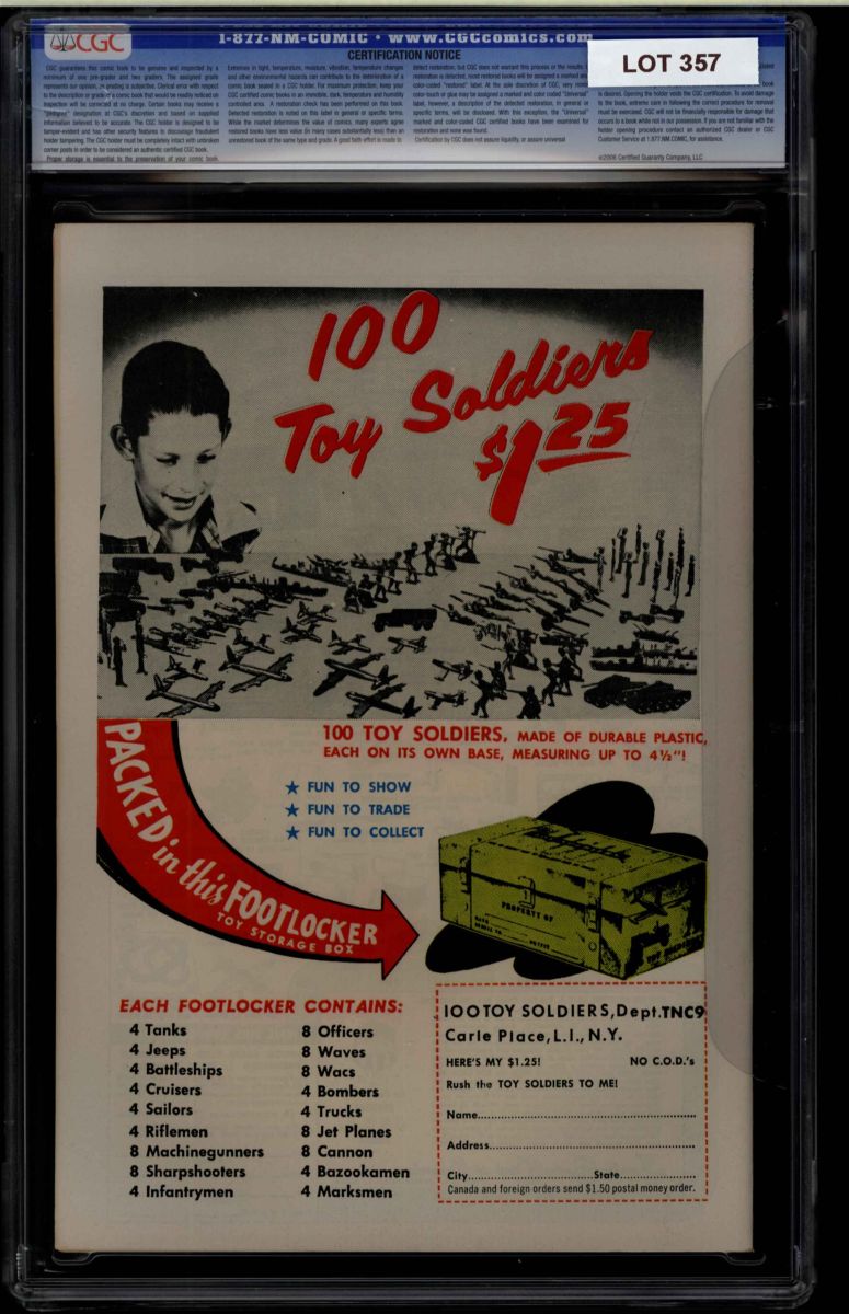 The Auctioneer has reserved the right to reject any and all bids, and to bid at the auction. Auctioneers Auctions are not on approval. Auctioneer does not allow certified material to be returned because of possible differences of opinion with respect to the grade offered by any third party organization, dealer, or service. Absolutely no guarantee of grade is offered for un-certified property sold and subsequently submitted to a third-party grading service. There will be no exceptions to this policy. Under extremely limited circumstances, (e.g. gross cataloging error) a purchaser, who did not bid from the floor, may request Auctioneer to evaluate voiding a sale; such request must be made in writing detailing the alleged gross error, and submission of the lot to the Auctioneer must be pre-approved by the Auctioneer. Bidder must notify Auctioneer in writing of such request within three (3) days of the non-floor bidder receipt of the lot. Any lot that is to be evaluated must be in our offices within 30 days after Auction. Grading does not qualify for this evaluation process nor do such complaints constitute a basis to challenge the authenticity of a lot. AFTER THAT 30-DAY PERIOD, NO LOTS MAY BE RETURNED FOR REASONS OTHER THAN AUTHENTICITY. Lots returned must be housed intact in the original holder. No lots purchased by floor Bidders may be returned (including those Bidders acting as agents for others). Late remittance for purchases may be considered just cause to revoke all return privileges. B: Auctions conducted solely on the Internet have a THREE (3) DAY RETURN POLICY: Lots paid for within seven days of the Auction closing are sold with a three (3) day return privilege. You may return lots under the following conditions: Within three days of receipt of the lot, you must first notify Auctioneer by contacting Client Service by phone (314-680-8599) or e-mail (moundcityauctions@gmail.com), and immediately mail the lot(s) fully insured to the attention of Returns, Mound City Auctions 1081 Teson Rd. Hazelwood, MO. 63042. Lots must be housed intact in their original holder and in their original condition. You are responsible for the insured, safe delivery of any lots. Auctioneer will not be responsible for lots returned in non-registered mail or lots returned without prior authorization per section B. A non-negotiable return fee of 5% of the purchase price ($10 per lot minimum) will be deducted from the refund for each returned lot or billed directly. Postage and handling fees are not refunded. After the three-day period (from receipt), no items may be returned for any reason. Late remittance for purchases revokes all Return-Restock privileges. C: Bidders who have inspected the lots prior to the auction will not be granted any return privileges. D: Comic books sold referencing a third-party grading service are sold “as is” without any express or implied warranty. Certain warranties may be available from the grading services and the Bidder is referred to them for further details: Certified Guaranty Company, LLC. (CGC), P.O. Box 4738, Sarasota, FL 34230. E: Bidders who intend to challenge authenticity or provenance of a lot must notify Auctioneer in writing within thirty (30) days of the Auctions conclusion. In the event Auctioneer cannot deliver the lot or subsequently it is established that the lot lacks title, provenance, authenticity, or other transfer or condition issue is claimed, Auctioneer's liability shall be limited to rescission of sale and refund of purchase price; in no case shall Auctioneer's maximum liability exceed the high bid on that lot, which bid shall be deemed for all purposes the value of the lot. After one year has elapsed, Auctioneer's maximum liability shall be limited to any commissions and fees Auctioneer earned on that lot. F: All comics are guaranteed genuine, but are not guaranteed as to grade, since grading is a matter of opinion, an art and not a science, and therefore the opinion rendered by the Auctioneer or any third party grading service may not agree with the opinion of others (including trained experts), and the same expert may not grade the same item with the same grade at two different times. G: Since we cannot examine encapsulated comics, they are sold “as is”without our grading opinion, and may not be returned for any reason. Auctioneer shall not be liable for any patent or latent defect or controversy pertaining to or arising from any encapsulated collectible. In any such instance, purchaser's remedy, if any, shall be solely against the service certifying the collectible. H: Due to changing grading standards over time, differing interpretations, and to possible mishandling of items by subsequent owners, Auctioneer reserves the right to grade items differently than shown on certificates from any grading service that accompany the items. Auctioneer also reserves the right to grade items differently than the grades shown in the prior catalog should such items be reconsigned to any future auction. I: Although consensus grading is employed by most grading services, it should be noted as aforesaid that grading is not an exact science. In fact, it is entirely possible that if a lot is broken out of a plastic holder and resubmitted to another grading service or even to the same service, the lot could come back with a different grade assigned. J: Certification does not guarantee protection against the normal risks associated with potentially volatile markets. The degree of liquidity for certified collectibles will vary according to general market conditions and the particular lot involved. For some lots there may be no active market at all at certain points in time."
