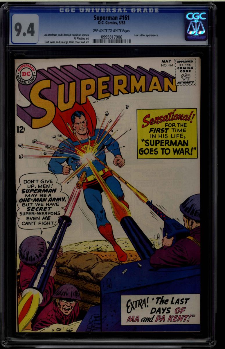 Superman #161 CGC 9.4 off-white to white pages. Leo Dorfman and Edmond Hamilton stories. Al Plastino art. Curt Swan and George Klein cover and art. Lex Luthor appearance. Overstreet 2009 NM 9.2 value = $210. CGC census: 2 at 9.4, none higher.