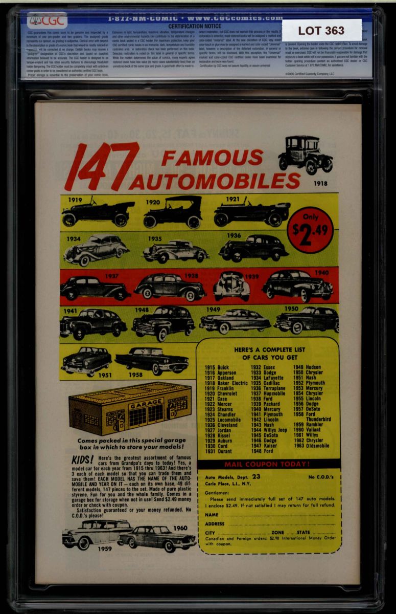The Auctioneer has reserved the right to reject any and all bids, and to bid at the auction. Auctioneers Auctions are not on approval. Auctioneer does not allow certified material to be returned because of possible differences of opinion with respect to the grade offered by any third party organization, dealer, or service. Absolutely no guarantee of grade is offered for un-certified property sold and subsequently submitted to a third-party grading service. There will be no exceptions to this policy. Under extremely limited circumstances, (e.g. gross cataloging error) a purchaser, who did not bid from the floor, may request Auctioneer to evaluate voiding a sale; such request must be made in writing detailing the alleged gross error, and submission of the lot to the Auctioneer must be pre-approved by the Auctioneer. Bidder must notify Auctioneer in writing of such request within three (3) days of the non-floor bidder receipt of the lot. Any lot that is to be evaluated must be in our offices within 30 days after Auction. Grading does not qualify for this evaluation process nor do such complaints constitute a basis to challenge the authenticity of a lot. AFTER THAT 30-DAY PERIOD, NO LOTS MAY BE RETURNED FOR REASONS OTHER THAN AUTHENTICITY. Lots returned must be housed intact in the original holder. No lots purchased by floor Bidders may be returned (including those Bidders acting as agents for others). Late remittance for purchases may be considered just cause to revoke all return privileges. B: Auctions conducted solely on the Internet have a THREE (3) DAY RETURN POLICY: Lots paid for within seven days of the Auction closing are sold with a three (3) day return privilege. You may return lots under the following conditions: Within three days of receipt of the lot, you must first notify Auctioneer by contacting Client Service by phone (314-680-8599) or e-mail (moundcityauctions@gmail.com), and immediately mail the lot(s) fully insured to the attention of Returns, Mound City Auctions 1081 Teson Rd. Hazelwood, MO. 63042. Lots must be housed intact in their original holder and in their original condition. You are responsible for the insured, safe delivery of any lots. Auctioneer will not be responsible for lots returned in non-registered mail or lots returned without prior authorization per section B. A non-negotiable return fee of 5% of the purchase price ($10 per lot minimum) will be deducted from the refund for each returned lot or billed directly. Postage and handling fees are not refunded. After the three-day period (from receipt), no items may be returned for any reason. Late remittance for purchases revokes all Return-Restock privileges. C: Bidders who have inspected the lots prior to the auction will not be granted any return privileges. D: Comic books sold referencing a third-party grading service are sold “as is” without any express or implied warranty. Certain warranties may be available from the grading services and the Bidder is referred to them for further details: Certified Guaranty Company, LLC. (CGC), P.O. Box 4738, Sarasota, FL 34230. E: Bidders who intend to challenge authenticity or provenance of a lot must notify Auctioneer in writing within thirty (30) days of the Auctions conclusion. In the event Auctioneer cannot deliver the lot or subsequently it is established that the lot lacks title, provenance, authenticity, or other transfer or condition issue is claimed, Auctioneer's liability shall be limited to rescission of sale and refund of purchase price; in no case shall Auctioneer's maximum liability exceed the high bid on that lot, which bid shall be deemed for all purposes the value of the lot. After one year has elapsed, Auctioneer's maximum liability shall be limited to any commissions and fees Auctioneer earned on that lot. F: All comics are guaranteed genuine, but are not guaranteed as to grade, since grading is a matter of opinion, an art and not a science, and therefore the opinion rendered by the Auctioneer or any third party grading service may not agree with the opinion of others (including trained experts), and the same expert may not grade the same item with the same grade at two different times. G: Since we cannot examine encapsulated comics, they are sold “as is”without our grading opinion, and may not be returned for any reason. Auctioneer shall not be liable for any patent or latent defect or controversy pertaining to or arising from any encapsulated collectible. In any such instance, purchaser's remedy, if any, shall be solely against the service certifying the collectible. H: Due to changing grading standards over time, differing interpretations, and to possible mishandling of items by subsequent owners, Auctioneer reserves the right to grade items differently than shown on certificates from any grading service that accompany the items. Auctioneer also reserves the right to grade items differently than the grades shown in the prior catalog should such items be reconsigned to any future auction. I: Although consensus grading is employed by most grading services, it should be noted as aforesaid that grading is not an exact science. In fact, it is entirely possible that if a lot is broken out of a plastic holder and resubmitted to another grading service or even to the same service, the lot could come back with a different grade assigned. J: Certification does not guarantee protection against the normal risks associated with potentially volatile markets. The degree of liquidity for certified collectibles will vary according to general market conditions and the particular lot involved. For some lots there may be no active market at all at certain points in time."