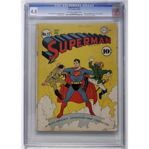 <B>Superman #17 (DC, 1942) CGC VG+ 4.5 Off-white to white pages.</B></I> One highlight of this early issue is the Fred Ray cover, which has the Man of Steel grabbing the squirming Hitler and Hirohito. Other features include the first Fortress of Solitude and a Lex Luthor appearance. Supes' co-creator Joe Shuster provided interior art. Overstreet 2007 VG 4.0 value = $614. CGC census 6/07: 2 in 4.5, 17 higher.<BR><BR><b>Shipping:</b> Comics - Slabbed (certified) (<a target="_blank" href="http://www.heritageauctions.com/common/shipping.php">view shipping information</a>)