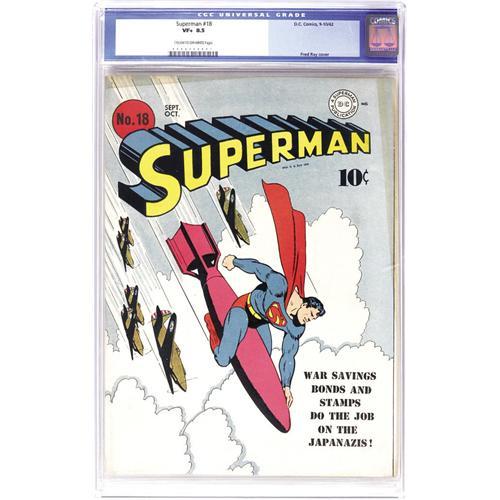 <B>Superman #18 (DC, 1942) CGC VF+ 8.5 Cream to off-white pages.</B></I> A Fred Ray World War II cover kicks off this early issue. John Sikela, Leo Nowak, and Ed Dobrotka are all featured story artists. Overstreet 2006 VF 8.0 value = $1,156; VF/NM 9.0 value = $1,828. CGC census 6/06: 2 in 8.5, 2 higher. <BR><BR><B>Important notice:</B> Heritage usually auctions material at the rate of 200-250 lots per hour. On some occasions eBay Live bid software or the Internet may not be able to keep up with the pace of the auction. We recommend placing a realistic absentee bid now as insurance to avoid disappointment. Occasionally the auctioneer may eliminate or reject an eBay Live bid, and the auctioneer may also reopen a lot after the close of the eBay live bidding (usually because we missed an audience bid), and may reject your bid even if it shows you as the winning bidder. By bidding via eBay Live, you agree that Heritage may award the lot to another bidder at its sole discretion under the circumstances described above or any other reasonable circumstances. Since eBay bids are not shown to us until we open the lot on the floor, we treat those bids just like floor bids. In most cases the floor responds before the eBay bid is presented to us, due to Internet lag time, so for consistency we have made it a policy that floor bids are always considered first over tie eBay live bids. Also please note that all Heritage lots purchased through eBay Live carry a 22.5% Buyer's Premium. Please make sure you read the Terms and Conditions before you bid. This lot is being auctioned in conjunction with a live floor auction by Heritage Auction Galleries. All final auction and invoice information will be supplied by Heritage Auction Galleries, and all other information should be considered preliminary. Lot:41001 <BR><BR><B>Winning Notification and Billing:</B> After the FINAL session in this auction is complete, Heritage will send e-mail and snail mail invoices. This process normally takes several days. All final auction and invoice information will be supplied by Heritage Auction Galleries, and all other information should be considered preliminary. <BR><BR>This auction will be conducted on a live auction floor and over the Internet through eBay Live. If you choose to place an absentee bid, please take a moment to <font color='#0000ff'><u><a href='http://pages.ebay.com/liveauctions/help/before/laabsentee.html'>learn how eBay Live absentee bidding works</a></u></font><font color='#000000'>