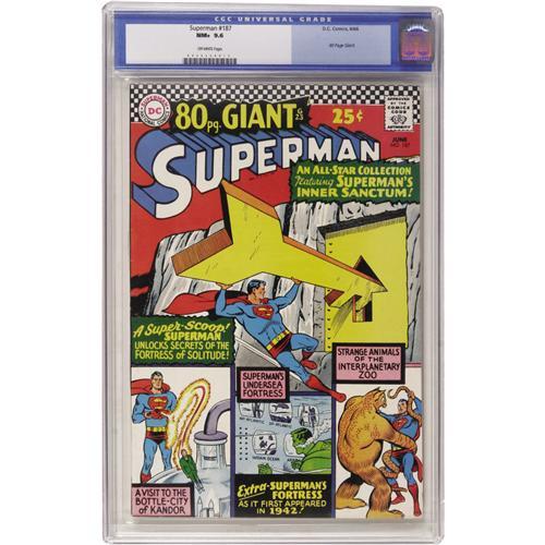 <B>Superman #187 (DC, 1966) CGC NM+ 9.6 Off-white pages.</B></I> Here's an obviously unread copy -- since you can't see it from the side on our scan, let us mention that the spine looks great! This issue, aka <B>80-Page Giant</B></I> G-23, spotlights one of the coolest things about Superman, namely his Fortress of Solitude. The cover art is by Curt Swan. Overstreet 2006 NM- 9.2 value = $105. CGC census 3/07: 5 in 9.6, none higher.<BR><BR><b>Shipping:</b> Comics - Slabbed (certified) (<a target="_blank" href="http://www.heritageauctions.com/common/shipping.php">view shipping information</a>)