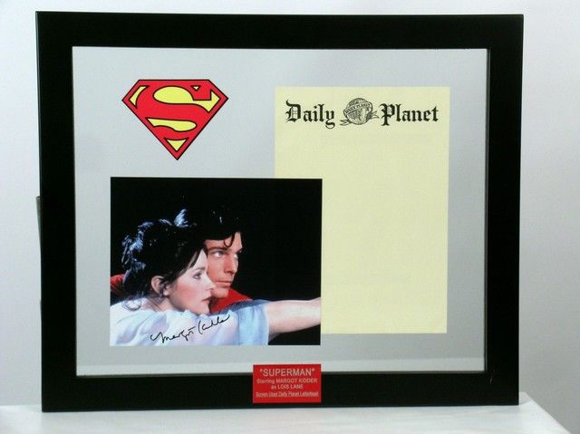 Who can ever forget the sexy and magical sequence when Superman (Christopher Reeve) lifts Lois Lane (Margot Kidder) off her high-rise apartment balcony and files her through the city by the light of the moon while the love theme "Can You Read My Mind" plays in the background? To commemorate one of the most romantic moments in movie history From "Superman" (1978), this is a beautifully framed display with a signed autograph photo by Ms. Kidder on a photo of her and Superman in mid-flight above the city. It also includes a rare actual piece of screen used Daily Planet stationary, where, of course Lois was a reporter. Also includes the official Superman Logo, as well as a custom plaque which reads: "SUPERMAN- STARRING MARGOT KIDDER AS LOIS LANE-SCREEN USED DAILY PLANET LETTERHEAD". Comes with a COA from Todd Mueller Autographs for the Margot Kidder signature, and a COA for the set of Daily Planet Screen used stationary from Prop Store. Frame is Approx. 22.5" x 18.5".